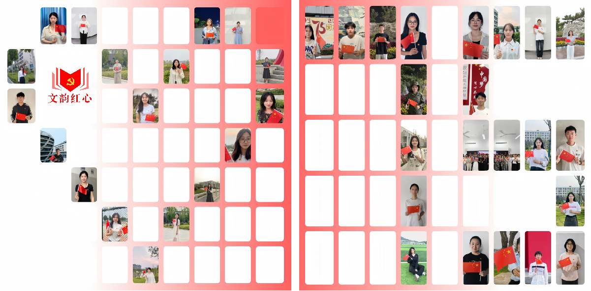 尤为值得一提的是,学院还将收集到的党员照片进行创意编排,精心冲洗并制作成“爱心”与“75”两个大型图案。这两个图案不仅寓意着全体党员师生心向祖国、共庆华诞的深情厚意,也展现了“文韵红心”党建品牌的独特魅力。这一创意展示成为了校园里一道亮丽的风景线,吸引了广大师生的驻足观看,激发了更多人的爱国热情和民族自豪感。