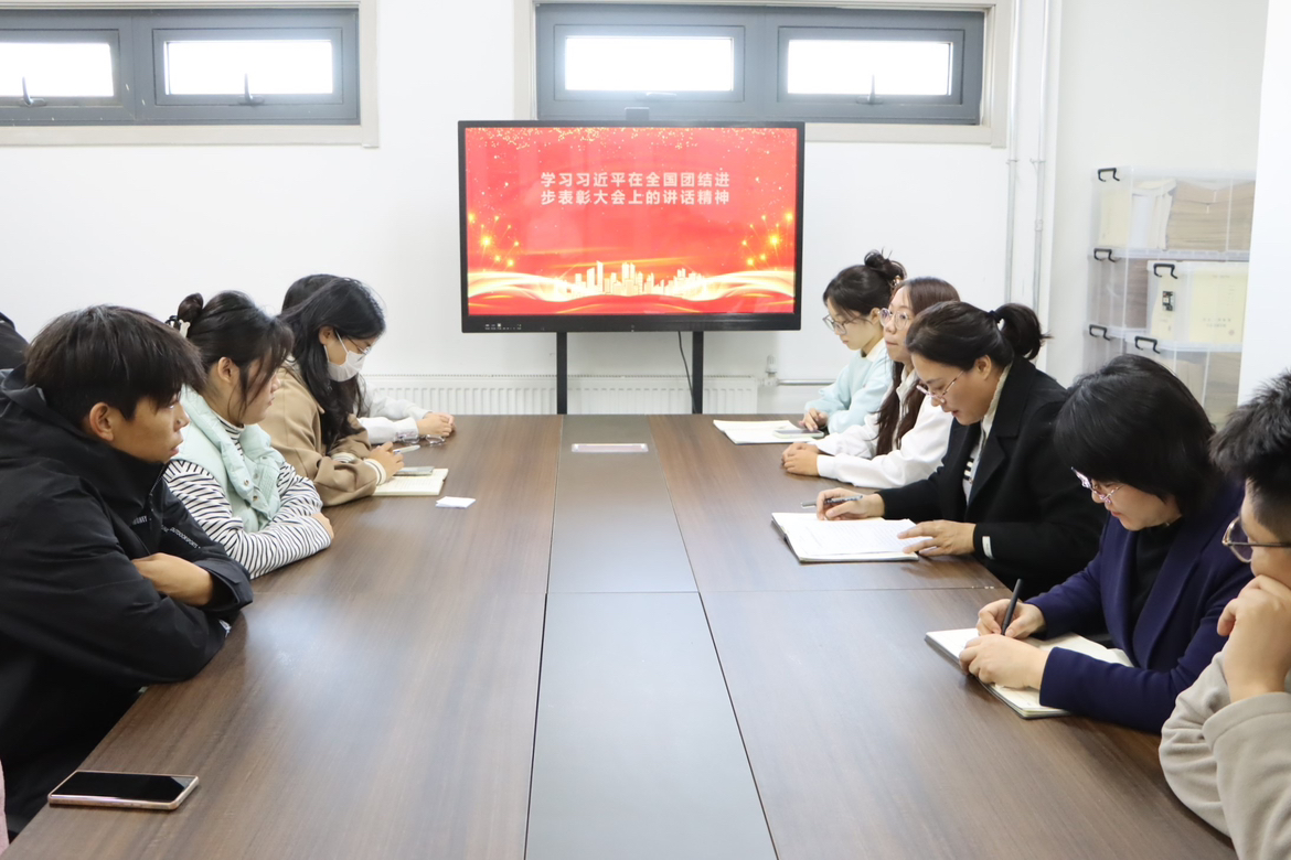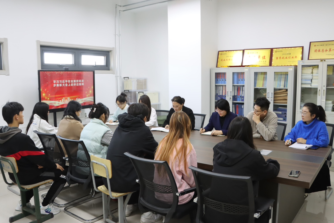 11月25日下午, beat365英国官方网站积极响应国家号召,组织十余名少数民族学生,深入学习习近平总书记在全国民族团结进步表彰大会上的重要讲话精神,党委副书记华莹出席,统战委员王元元及辅导员代表参加。