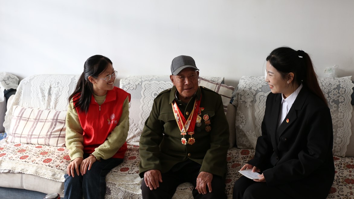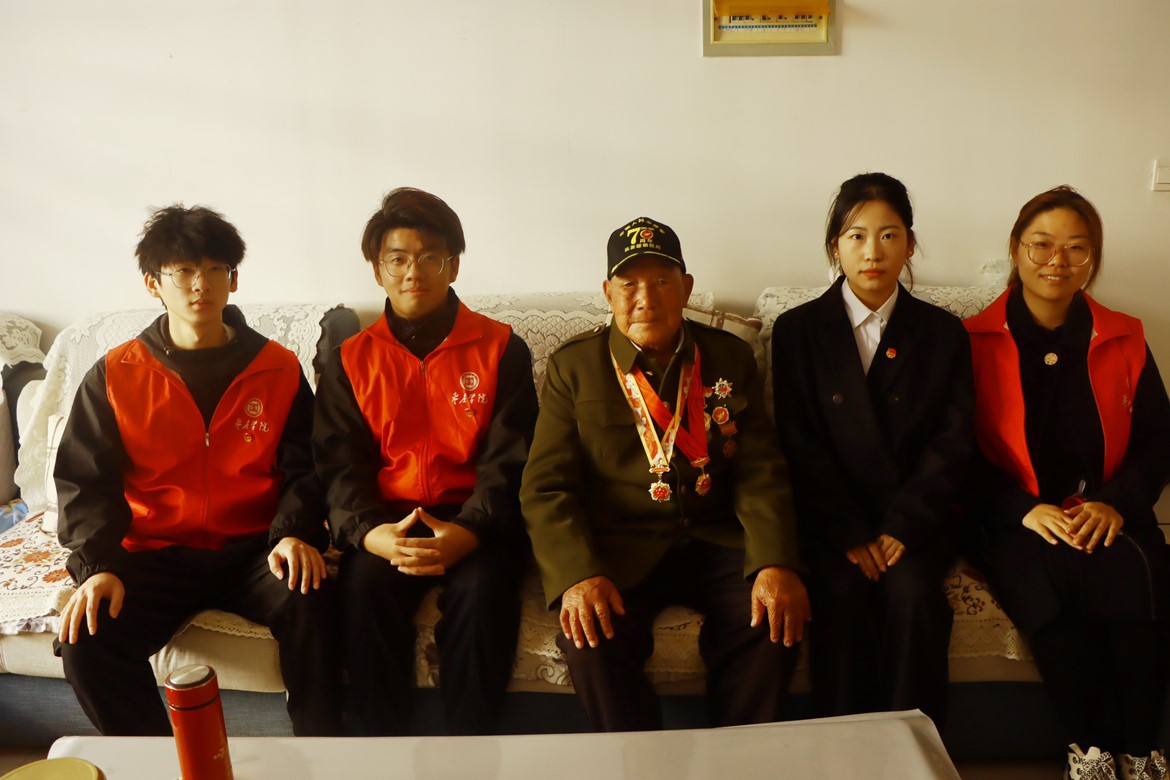 本次活动志愿者们有幸见到了曾参加过朝鲜战役的96岁退役老兵张传水同志。志愿者们围坐在张传水老人的身边,认真倾听老人精彩而又艰苦的军旅生活。在半米尺的雪地中埋伏,在医院中昏迷两天两夜,“越打越大胆,打仗就靠硬拼。”炸碉堡、躲空袭、打埋伏…张传水老人缓缓讲述着自己的抗战故事,鼓励同学们要不忘前耻,努力学习,争当对国家社会有所贡献的时代新人。各位志愿者都积极表示一定会向张传水老人学习,将个人融入国家与社会当中,将宝贵的红色精神传承下去。临别之际,志愿者们送上了精心准备的礼物,对老人的热情接待表示了真挚的感谢。