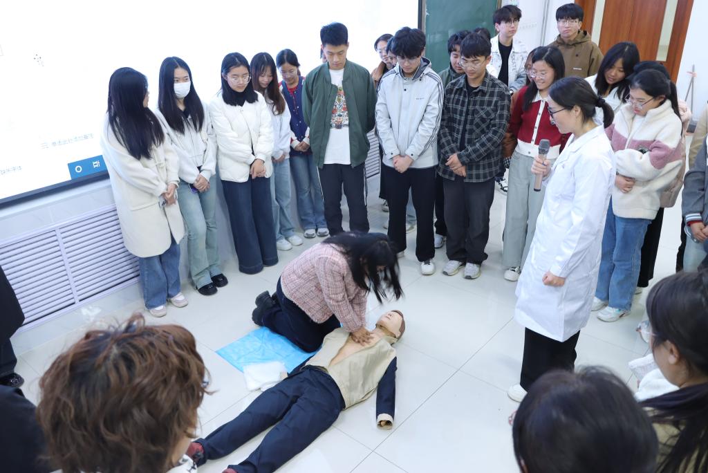培训现场,刘祥艳还邀请学生们上台实操,对操作中出现的不规范做法进行纠正,手把手教学,有效增强了同学们的急救意识,提高了应对突发事件和意外伤害的应变能力,也为自己和身边的人加上一道生命的屏障,营造了“人人学急救,急救为人人”的良好氛围。