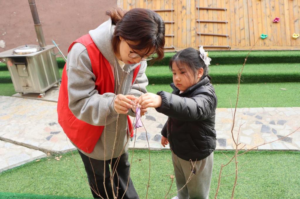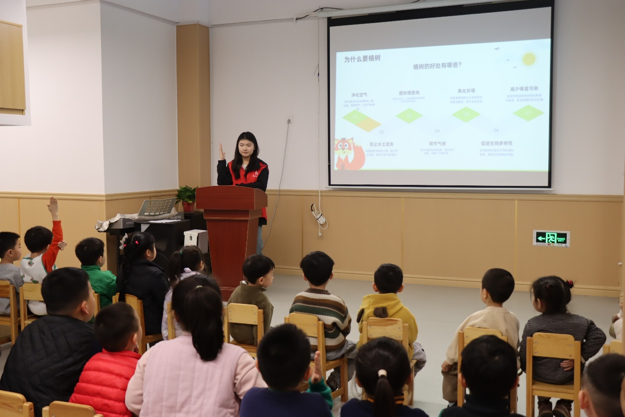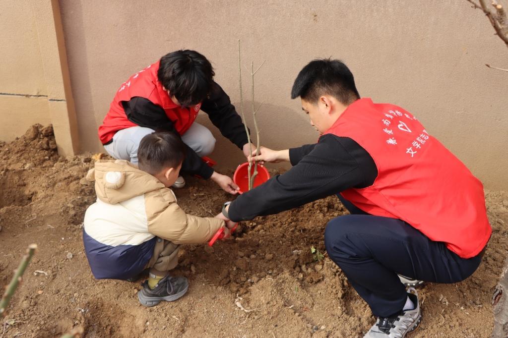 春日暖阳,风与光都温柔地洒在校园。在植树现场,身穿红马甲的志愿者“大朋友”们与活泼可爱的小朋友们,一起培土、浇水,共同栽下一棵棵爱心树。在同学们的帮助下,孩子们把一片片写有“爱心树”“友谊林”“绿宝贝”心愿卡系在树枝上。崭新的树苗轻轻摇曳,沾着泥点的小脸上绽放着童真。在教室里,同学们通过精心准备的PPT,向小朋友们讲解植树节的由来,讲述树木森林创造宜居生态环境的重要意义,分享人与自然和谐生共处的故事。小朋友们认真聆听,踊跃发言,欢声笑语不断。