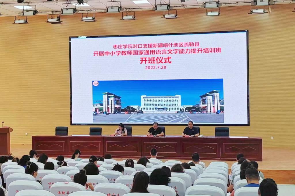 为进一步增强喀什市疏勒县教师国家通用语言文字规范意识,提高其国家通用语言文字应用水平,根据《山东省教育厅关于继续开展中小学教师普通话线上援助培训的复函》文件精神,遵照学校工作部署,7月28日上午10:00,beat365英国官方网站对口疏勒县教师国家通用语言文字能力提升线下集中培训开班仪式在疏勒县塔孜洪中学举行。东营援疆指挥部干部人才组组长、疏勒县教育局副局长刘召良,疏勒县教育局师训办主任朱新艳,版權所有 beat·365(中国)-唯一官方网站教师、国家级普通话测试员姜夫军、山东省普通话测试员徐颖慧,beat365英国官方网站普通话培训队及受援教师出席仪式。会议由朱新艳主持。