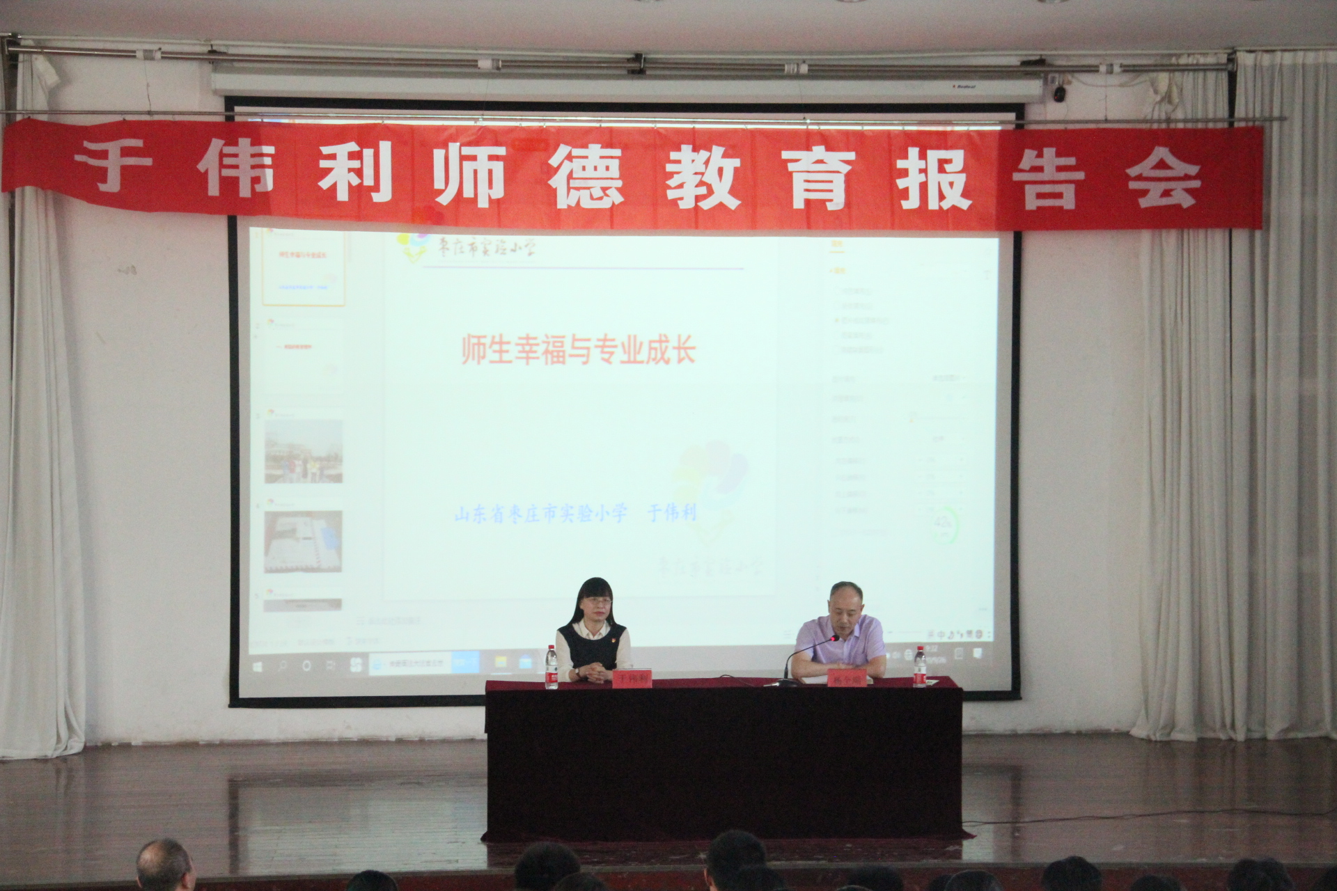 9月26日上午,beat365英国官方网站在文科楼报告厅举行了名师工作坊专家教育报告会,邀请国家“万人计划”领军人才,享受国务院政府特殊津贴专家,特级教师,正高级教师,全国教学名师,全国首届教育部“领航名师”、国家首届名师名校长“领航班成员”,全国小学语文课堂教学大赛特等奖,全国十佳班主任,全国三八红旗手,国家专利获得者,枣庄实验小学校长于伟利来beat365英国官方网站做师德教育报告。beat365英国官方网站副院长杨全顺主持了报告会,beat365英国官方网站2021届师范专业毕业生及汉语言文学专业的学生参加了报告会。