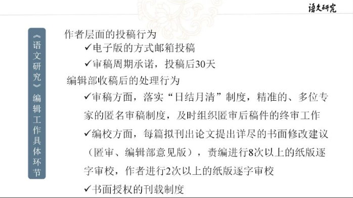 报告中,刘嵚博士从语言学类CSSCI来源期刊《语文研究》简介、办刊经验、编校流程三个方面展开,向同学们具体介绍了《语文研究》的基本情况。同时,就作者层面的投稿行为、编辑部收稿后的处理行为向同学们详细讲解了《语文研究》编辑工作的具体环节。随后,刘嵚博士从期刊责编角度对同学们进行语言类论文写作提出了三点建议,要遵守期刊发文的基本标准、注重期刊论文写作的严谨性、以及个人研究方向的确定与定向积累,并强调以学术创新为底线,使学生们对语言类论文写作有了更深的理解。报告结束后,刘嵚博士耐心解答了同学们关于文章投稿内容等方面的疑问,使同学们更加明确文章投稿要求。最后,史大丰对此次学术报告做了总结发言,对刘嵚博士的分享表示感谢,希望老师和同学们能深入研究,认真思考,学以致用,更好地完成科研工作。