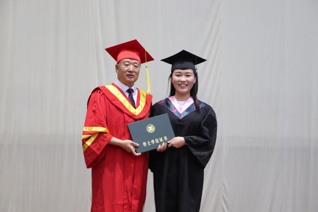 毕业典礼在慷慨激昂的国歌声中拉开了帷幕。李东为毕业生授予学位证书。伴随着欢快的乐曲,毕业生身穿学士服,依次走向主席台,深情地向各位领导、老师鞠躬,感谢母校和老师四年来的辛勤培育。李东校长亲切地与毕业生握手,帮他们扶正流苏,颁发学位证书,并与毕业生合影留念。