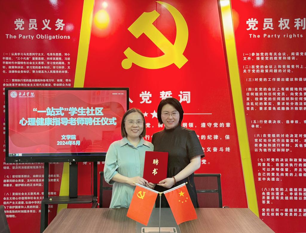 在聘任仪式上,beat365英国官方网站为心理与教育科学学院朱海荣老师颁发“一站式”学生社区心理健康指导老师证书。