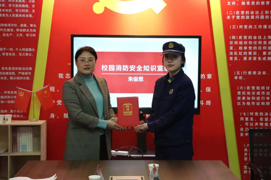 实操演练,技能提升。理论学习之后,进行了一场紧张而有序的消防器材使用实操演练。在朱俊思的指导下,大家不仅学会了如何正确使用干粉灭火器扑灭初期火灾,还亲身体验了消防水带的铺设与操作,确保每位参与者都能熟练掌握自救技巧。随后,王元元为朱俊思和朱晓仟颁发“一站式”学生社区消防安全指导教师聘书。