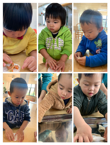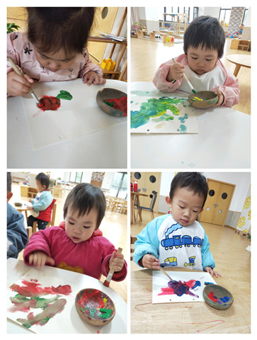 2岁左右的孩子们的作画,老师们没有给孩子们具象话,都是任由他们自由发挥,肆意想象。不得不说,孩子们总有他们独特的视角,他们的画笔一落,本以为会是一副“鬼画符”,其实在他们小小的心里,那就是他们探索自然、探索颜料最好的作品。