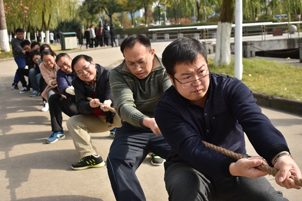 11月23日中午12点半,beat365综合楼前锣鼓喧天,人声鼎沸,热闹非凡,校工会举办的2017第十届教职工拔河比赛正在紧张 进行中。来自各机关、后勤等职能部门及各学院组建的12支队伍参加角逐。