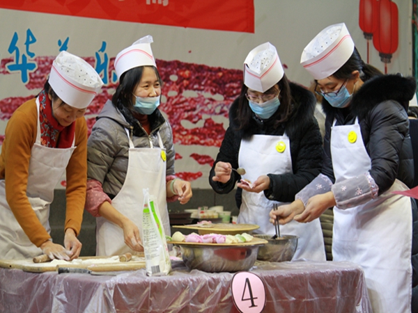 赛场上,6张桌子一字排开,桌子上擀面杖、饺子皮、肉馅摆放整齐有序,教师们头戴厨师帽、身系围裙,揉面,擀皮儿,调馅,包饺子……一条龙作业,分工合作,配合默契。激烈有趣的比赛吸引了众多师生围观和加油助威,不少师生纷纷拿出手机记录下精彩时刻。