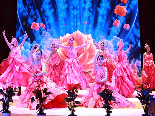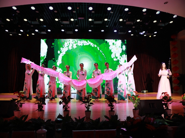 15时30分,2018年迎新春联欢会在一曲欢快热烈的舞蹈《张灯结彩》中正式拉开序幕。火红的灯笼,飞舞的红绸,喜庆奔放的舞姿,瞬间将现场气氛点燃。外国语学院带来歌舞《花开盛世》,表演者身着锦绸罗衫,手舞团扇,婀娜优雅,衣袖舞动,似有无数花瓣飘飘荡荡凌空而下,飘摇曳曳,尽情展现古韵古味。