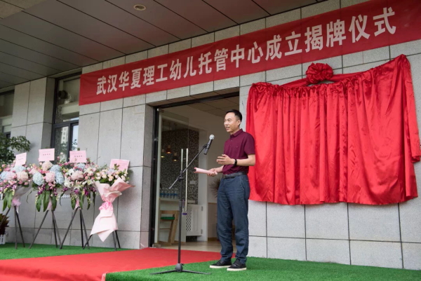 9时45分,张晓东、郭彪、阮进、罗波共同为当代教育·武汉华夏理工幼儿托管中心揭牌。
