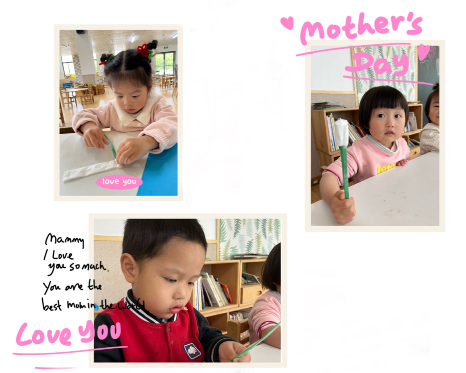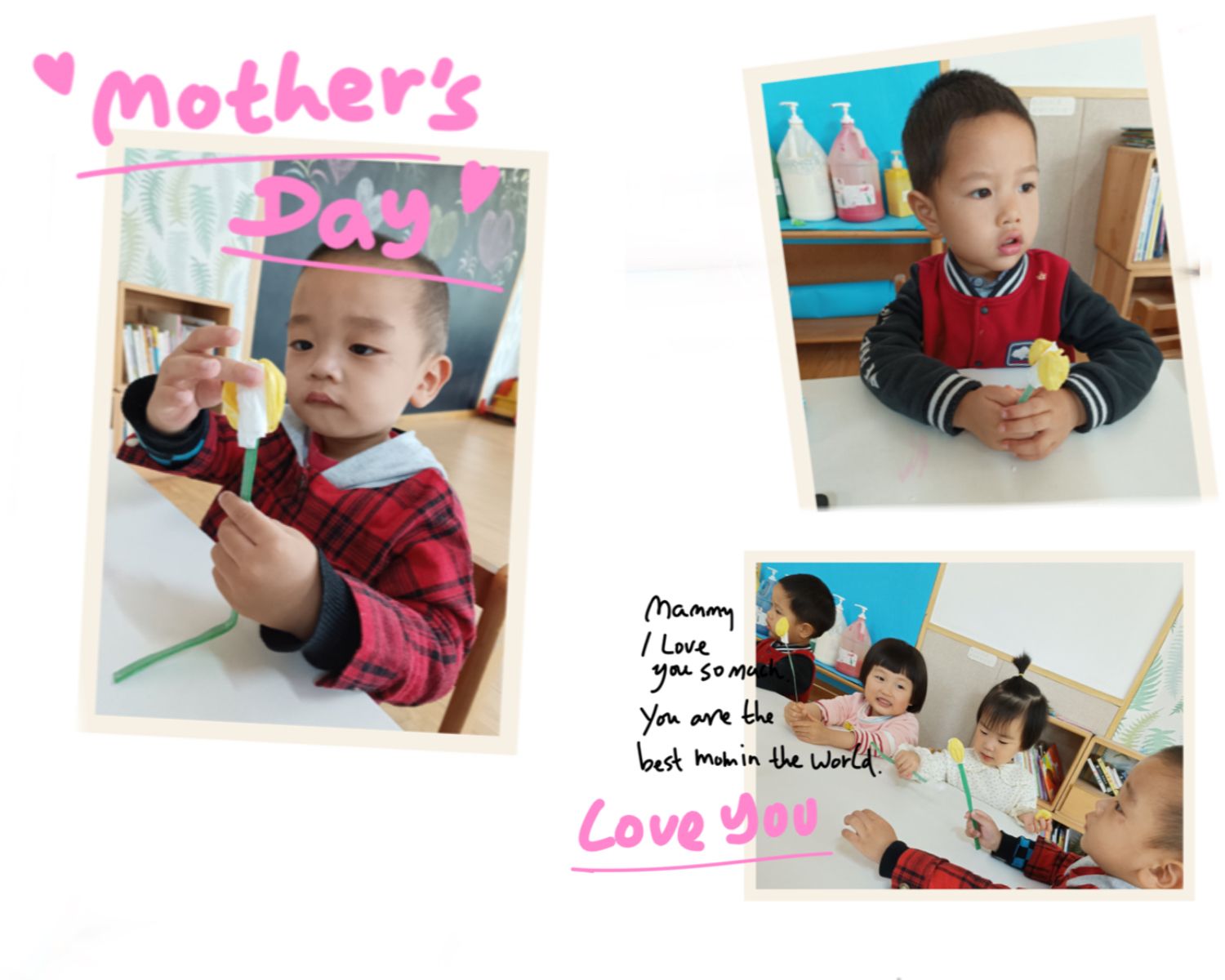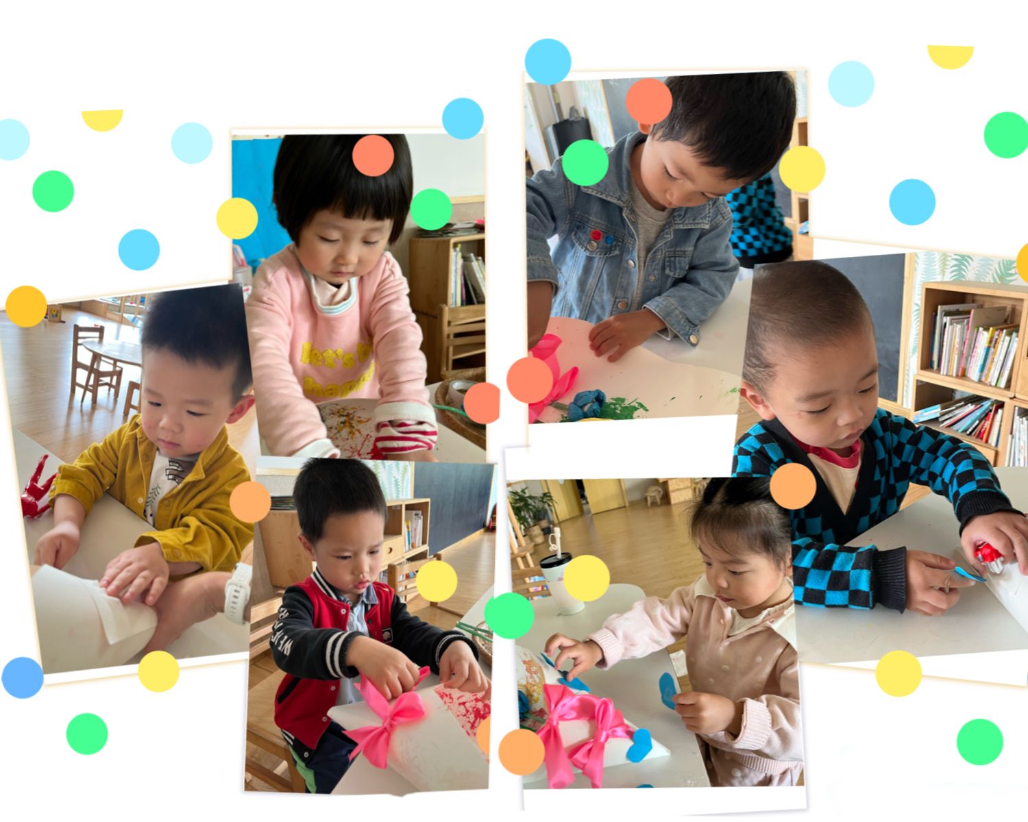 在母亲节这一天,人们会送给母亲鲜花、蛋糕,亲手烹制的饭菜等等礼物,让母亲们快乐地过节。我们托育中心的宝贝们也特地开展制作鲜花花束的手工活动,让宝贝用简单的方式来表达对妈妈的爱。