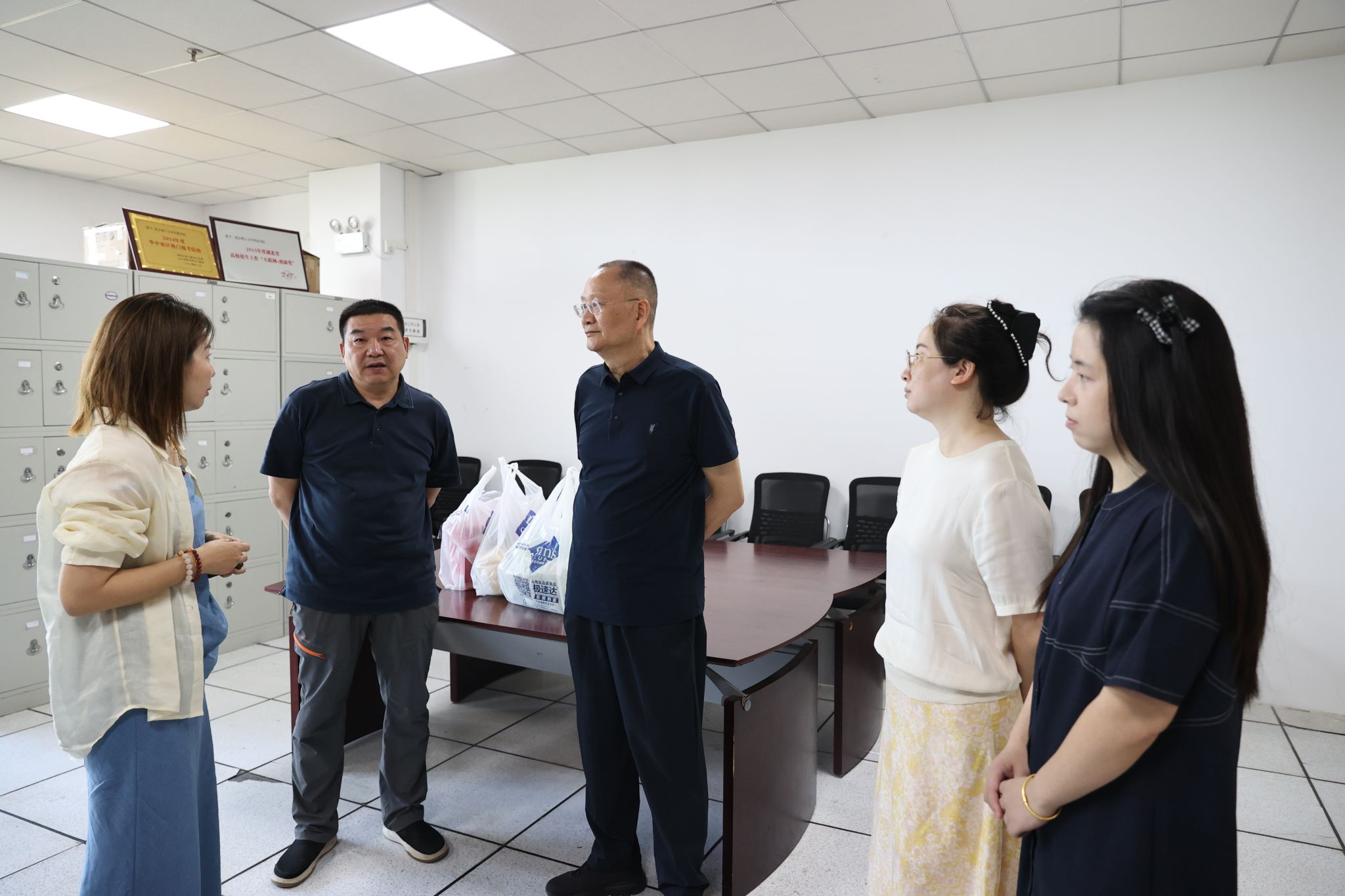 7月25日上午,校长吴永桥,校党委书记丁德智,副校长丁成忠,副校长李猜一行深入beat3652025年普通本科招生录取现场指导工作,亲切慰问奋战在一线的招生工作人员。吴永桥代表学校向全体招生人员表示衷心感谢,并送上防暑降温慰问品。