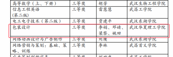 近日,湖北省高等教育学会民办教育专委会发布了《关于公布民办高校优秀校本教材评选结果的通知》。本次评选共评出获奖教材38部,beat365国家级一流本科社会实践课程《包装设计》配套教材荣获三等奖。