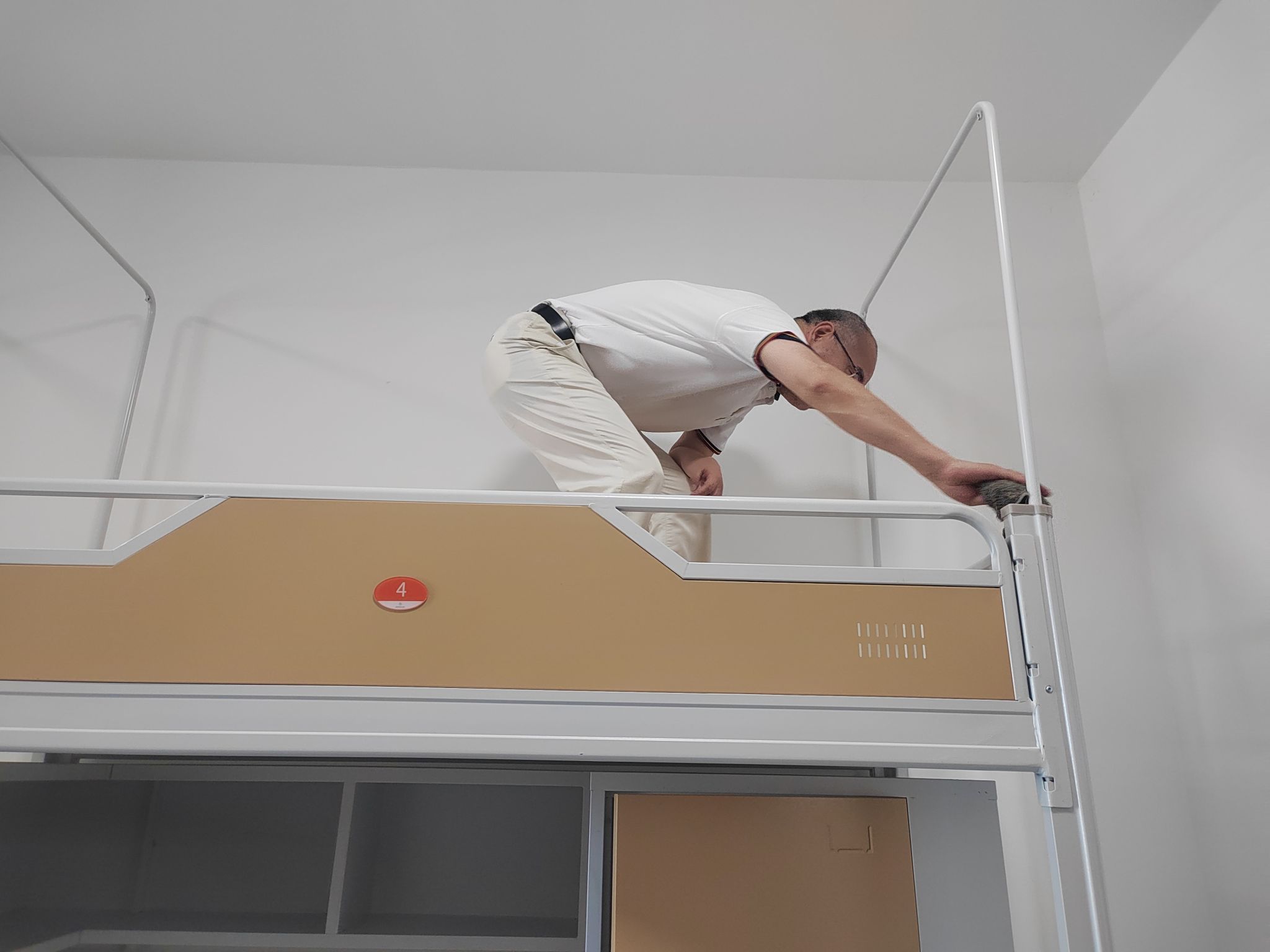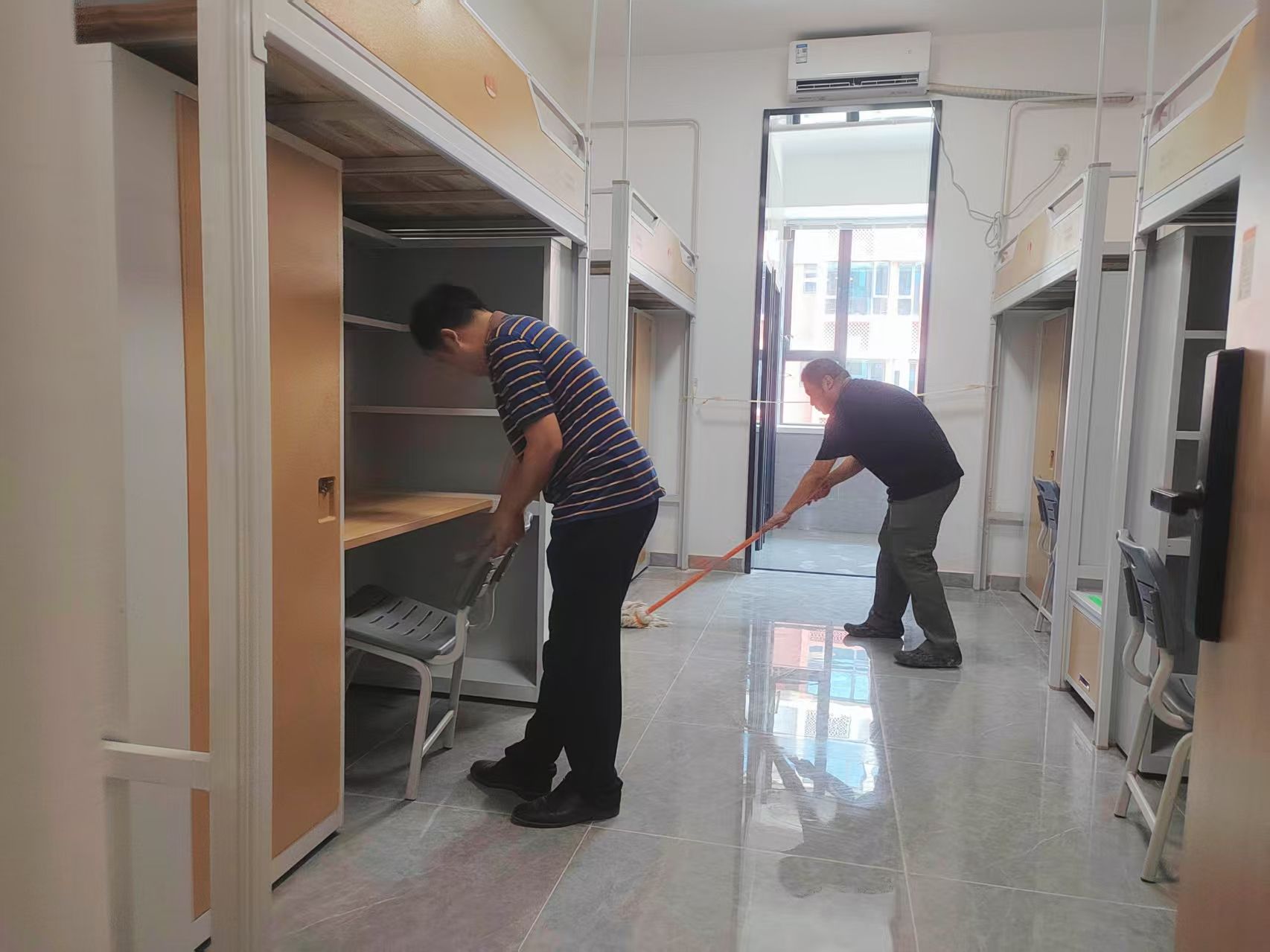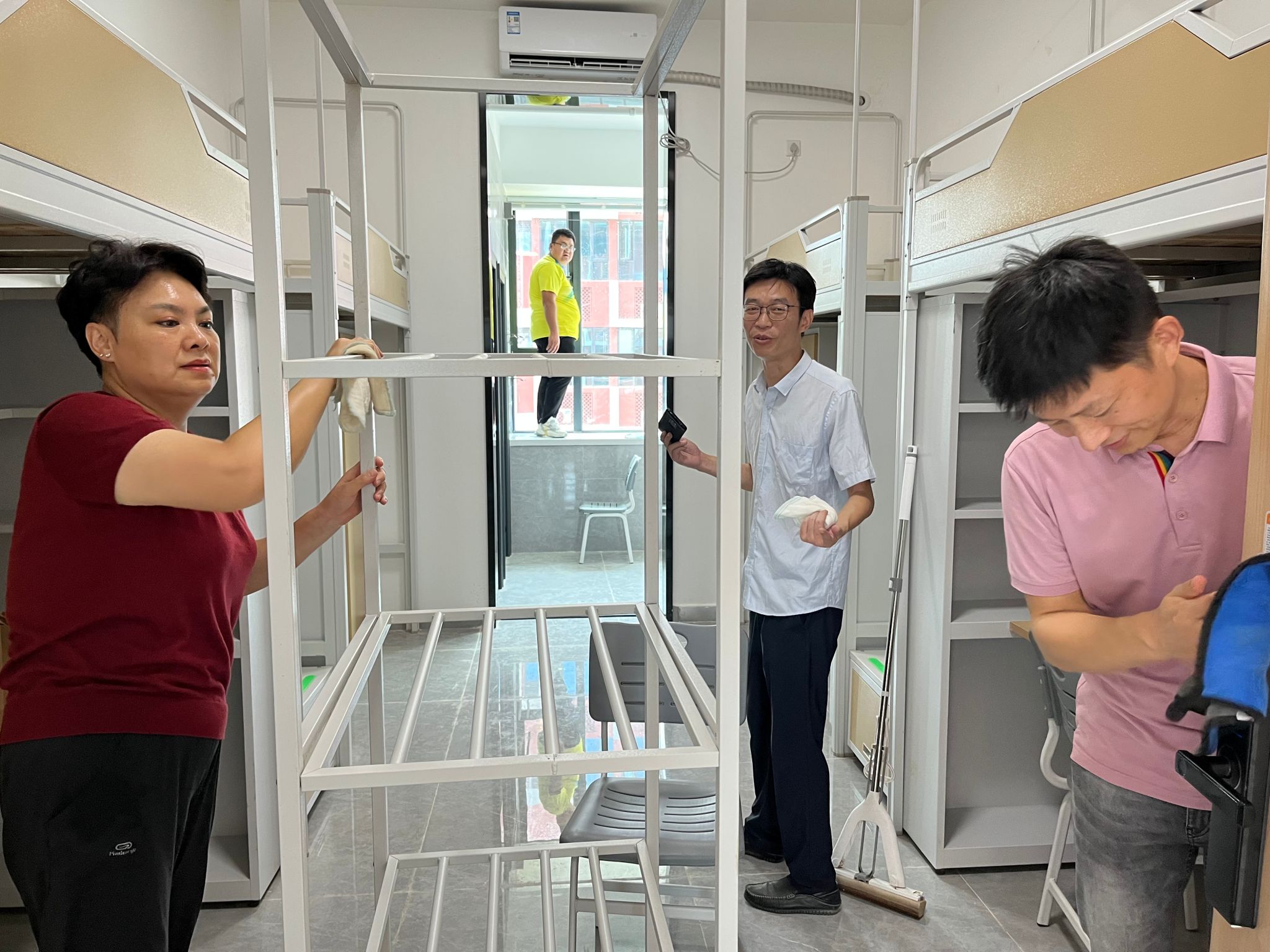 校长吴永桥,副校长丁成忠,党委副书记、副校长李海民,副校长李猜等校领导们以身作则、主动带头,与各学院教师一同走进新生宿舍,全力投入清洁和排查工作。各学院教师志愿者们分组逐间作业,对宿舍地面、衣柜、床体、卫生间、阳台等区域进行二次清洁,并逐一测试水电设备、空调、密码锁等设施,确保各项设备运转良好。党委书记丁德智还实地检查了双创中心、食堂后厨、洗消通道、留样冰箱等重点场所,开展安全隐患排查,并对发现问题现场督办整改,做到“发现一处、销号一处”。
