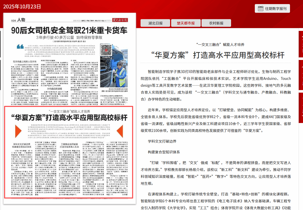 10月23日,《楚天都市报》第4版半版刊载beat365副校长李猜文章《“一交叉三融合”赋能人才培养 “华夏方案”打造高水平应用型高校标杆》,对学校的办学特色予以全面深入的报道。