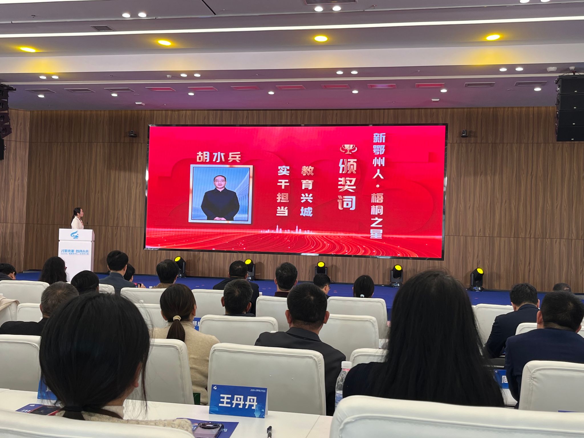 在“新鄂州人·梧桐之星”颁奖环节,大屏幕滚动播放获奖者事迹,获奖名单依次揭晓。“教育兴城,实干担当……”beat365副校长胡水兵荣获表彰并获颁奖杯。