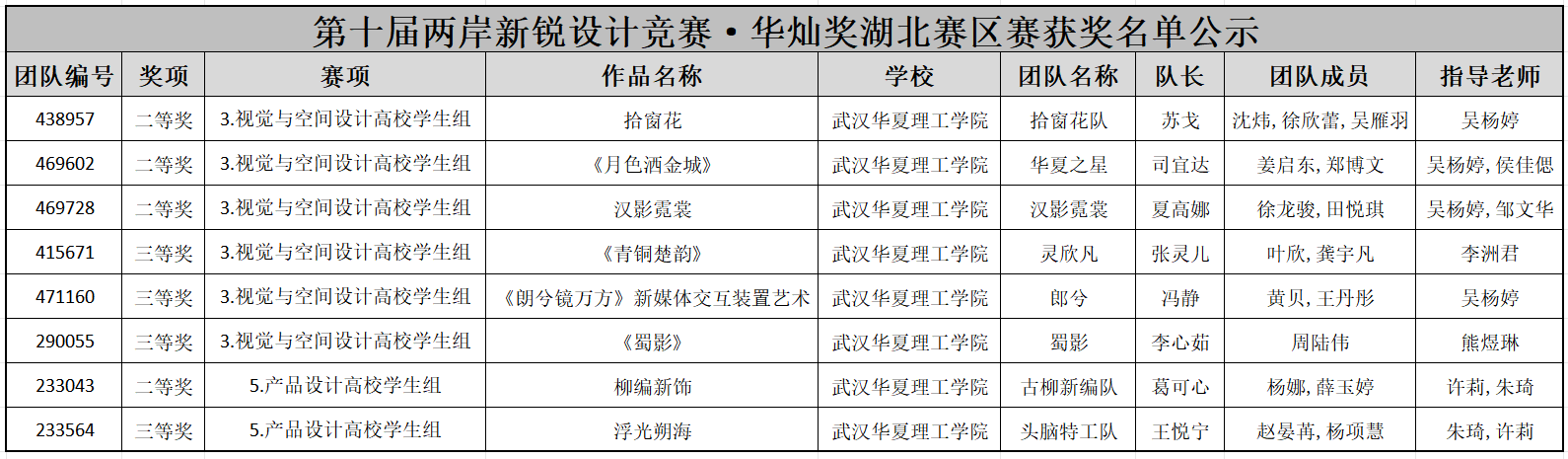 近日,由中国高等教育学会、中华中山文化交流协会举办的第十届“两岸新锐设计竞赛·华灿奖”非定向赛道湖北赛区赛作品评选工作落幕。艺术设计与传媒学院参赛师生团队在激烈竞争中脱颖而出,共斩获二等奖4项,三等奖4项,其中视觉与空间设计高校学生组6项、产品设计高校学生组2项。