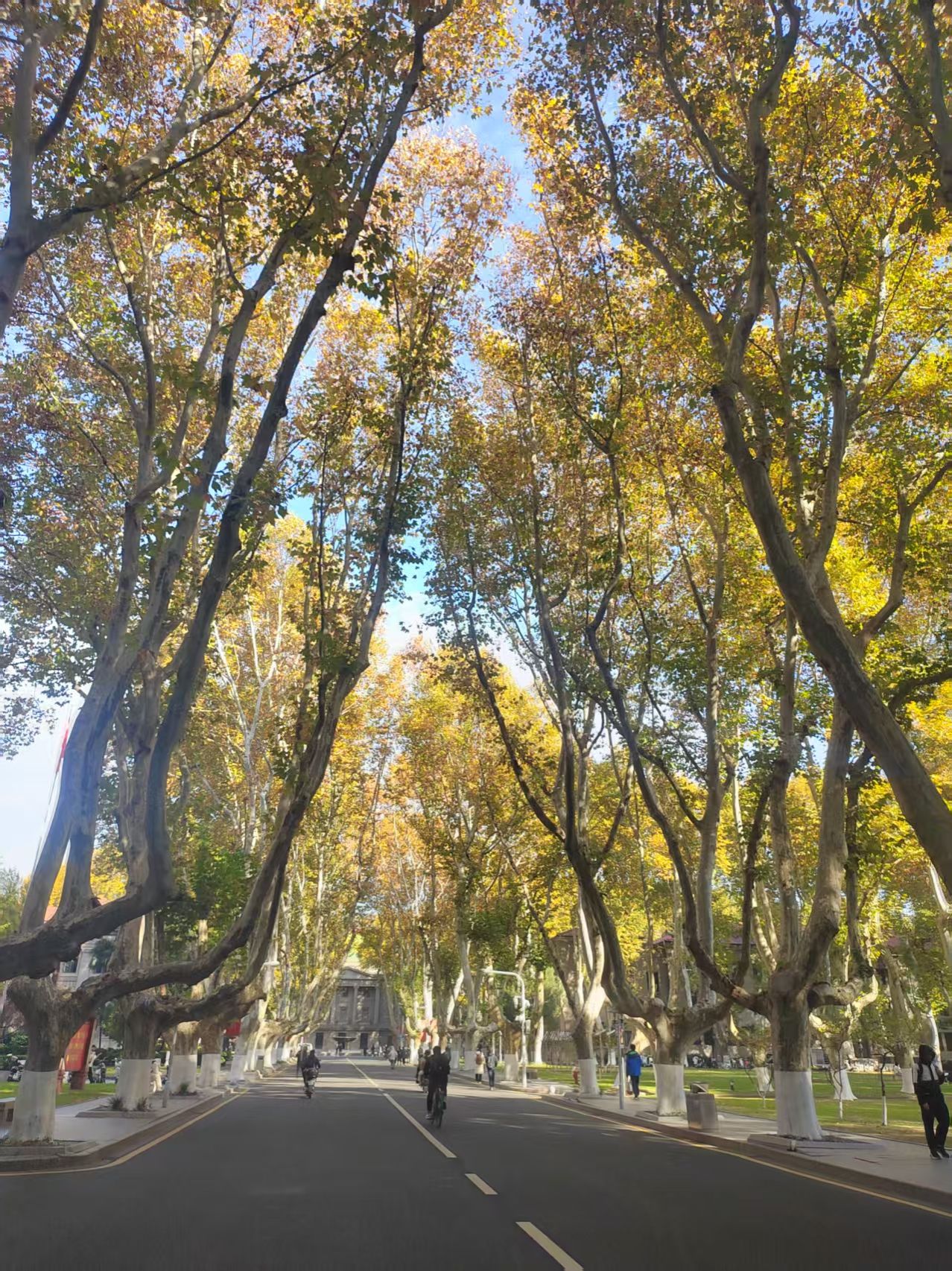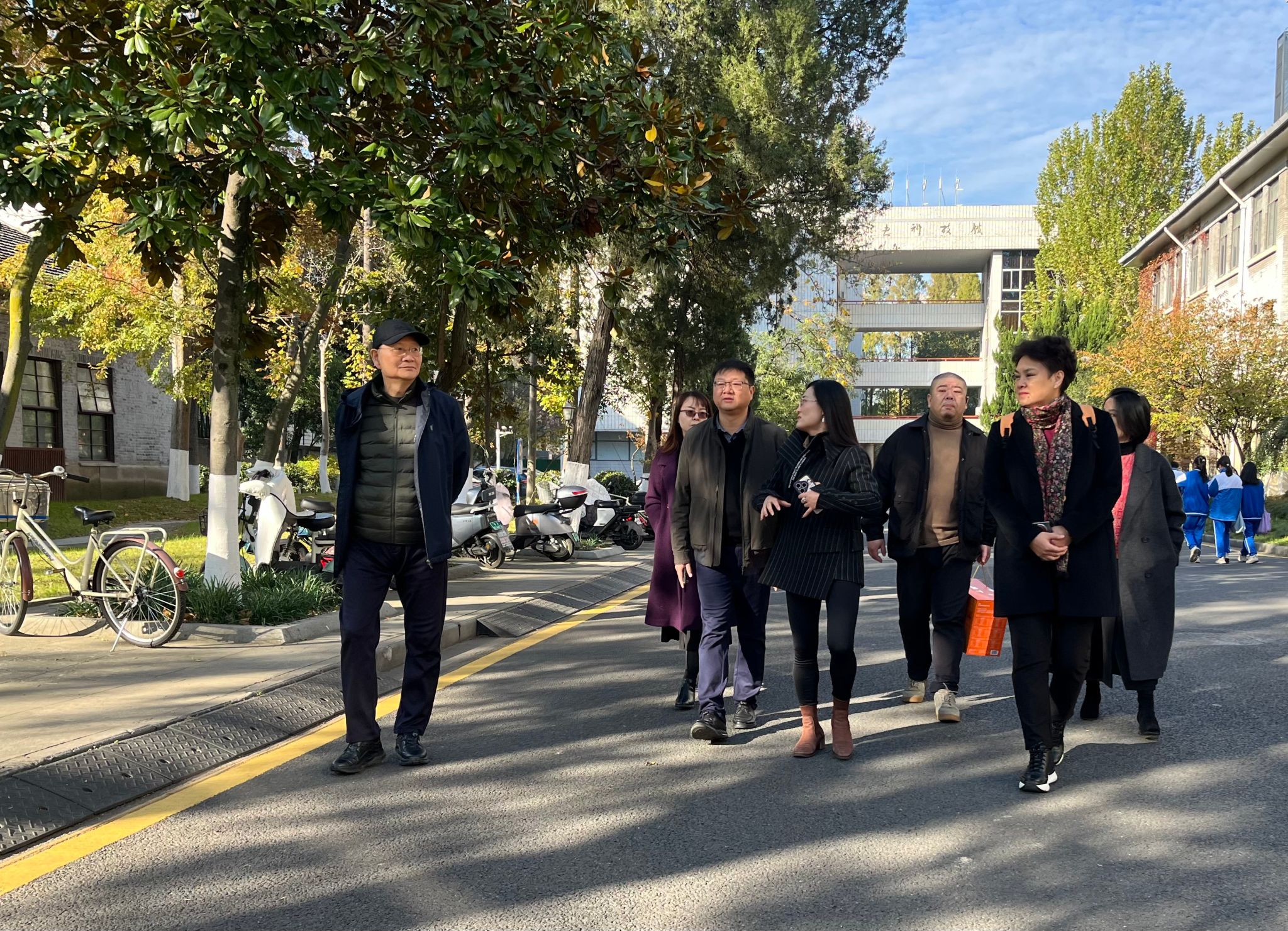 考察团一行在东南大学校园内进行了实地走访,以沉浸式体验的方式,重点考察了被誉为东大“文化名片”的梧桐大道、大礼堂等校园建筑与景观设计。时值初冬,梧桐叶落,遒劲的枝干与落叶共同勾勒出深厚的历史底蕴与宁静的学术氛围。吴永桥一行详细观察了道路规划、树木养护、周边建筑与自然景观的和谐共融,了解该校“寻味东南”系列美食文化节、职业发展“鸿图”大讲堂、梧桐文化节等系列活动,并不时就其文化内涵、育人功能及日常维护管理等细节深入交流。