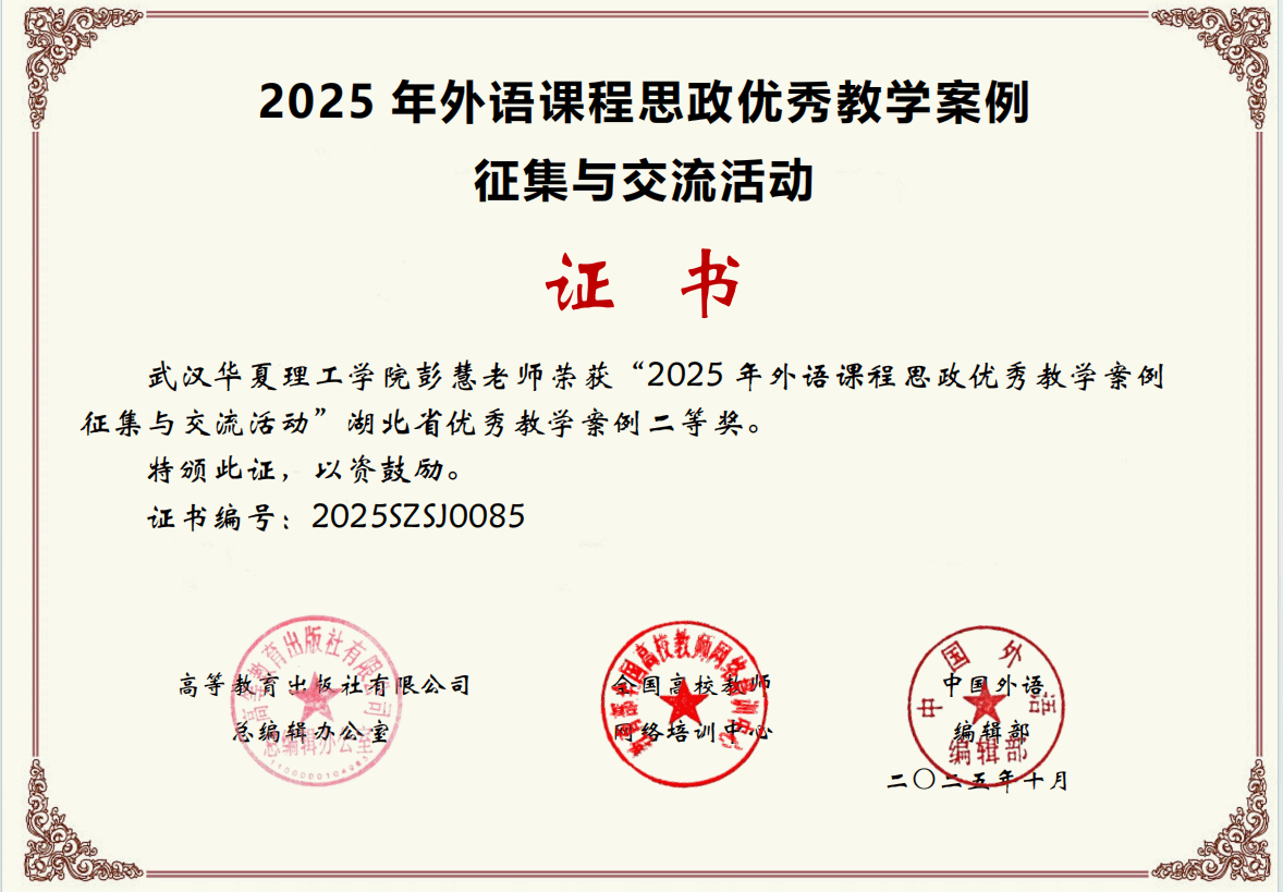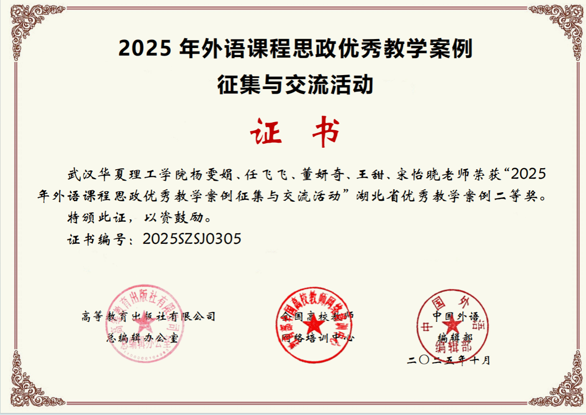 其中,由杨雯娟、任飞飞、董妍奇、王甜、宋怡晓五位教师组成的教学团队以及彭慧老师个人提交的教学案例,均荣获湖北省优秀教学案例二等奖。获奖案例紧密围绕外语教学目标,注重将价值引领有机融入语言知识传授与能力培养过程,教学设计巧妙,特色鲜明。