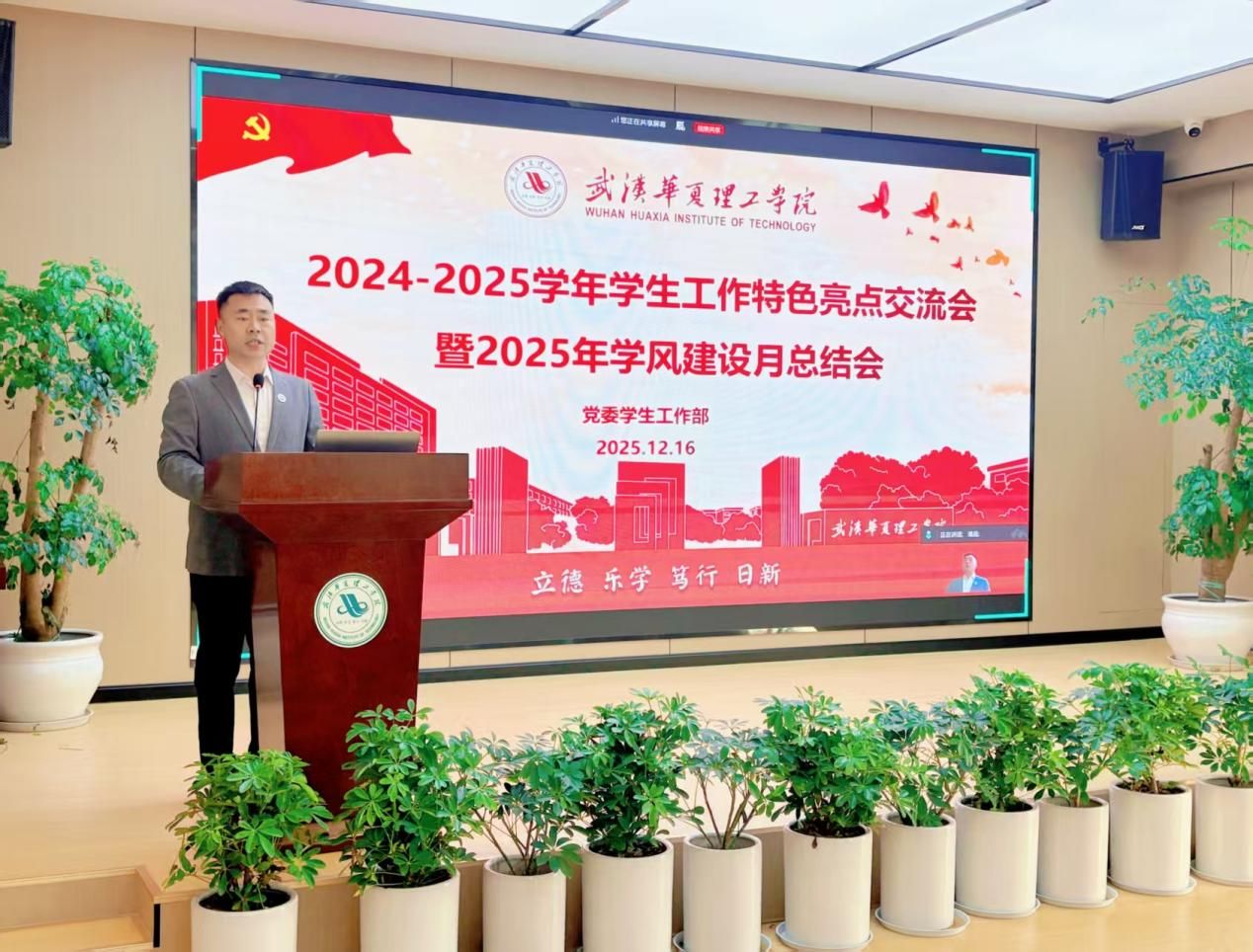 12月16日上午,2024-2025学年学生工作特色亮点交流会暨学风建设月总结会在多功能报告厅举行。副校长丁成忠,党委副书记、副校长李海民,校长助理、招生办公室主任赵杨,校长助理、工会主席李海燕,财务总监谭婧,校职能部门负责人以及全体学工教师参会,梧桐湖校区学工人员同步线上参会。会议由学生事务部副部长关宏达主持。