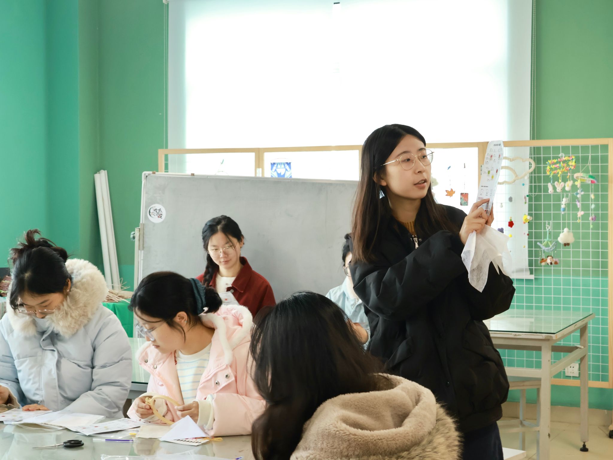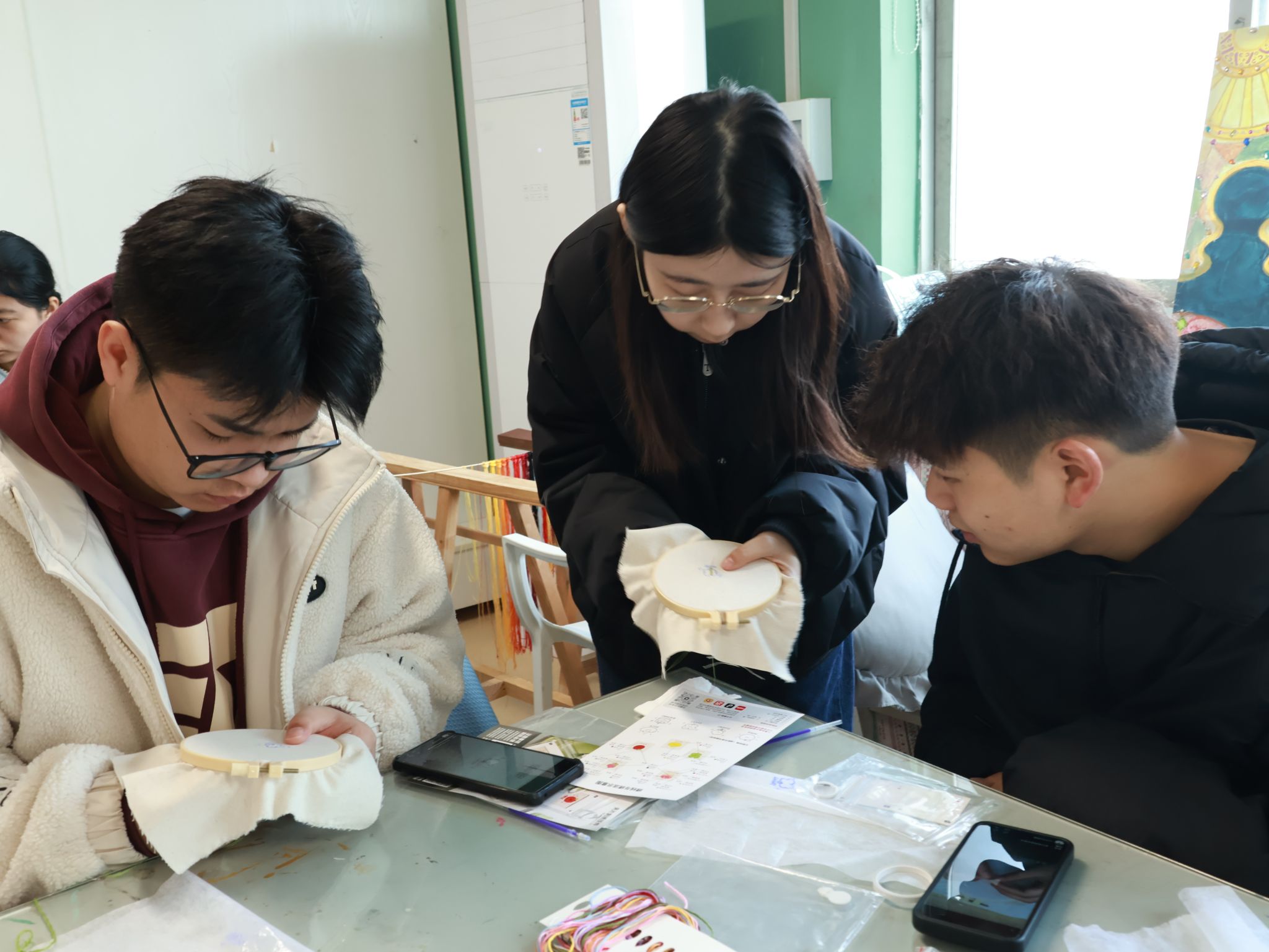 上午,刺绣体验活动在艺术设计与传媒学院焦洁老师的细致讲解中拉开帷幕。焦洁首先介绍了刺绣的历史源流,并亲手示范穿针、平针、锁边等基础技法,重点讲解了四叶草、花卉等图案的绣制要领与色彩搭配。同学们在轻柔的指导声中,渐渐领会“细如发丝、密如锦缎”的绣艺精髓。