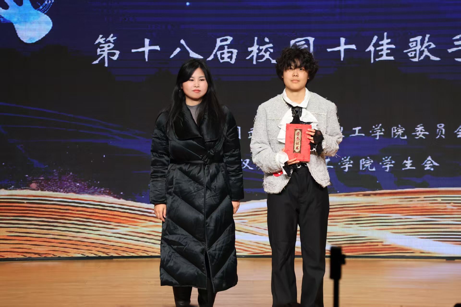 经评委团公平、公正、公开的专业评审,聂恩祈同学凭借超高人气荣获“最佳人气奖”,何小平老师为其颁奖。艾丽娜、张亦婷、莫晨锋、樊承健、沈恒宇、李金泽、冷依静、陈姝言、马惠、李彦彤十位同学荣膺本届校园“十佳歌手”称号,潘晶为其颁发荣誉证书与奖杯。