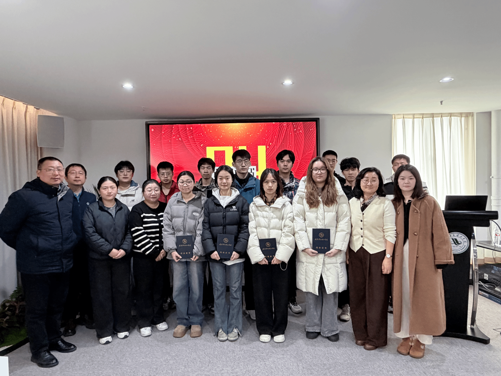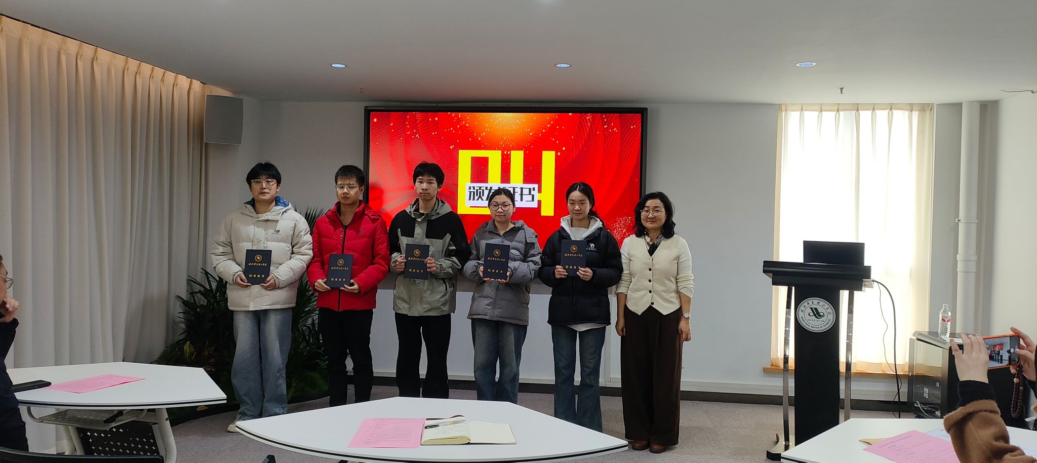 仪式最后,副校长李猜、科研部部长张城芳为结业学生代表颁发结业证书并合影留念。