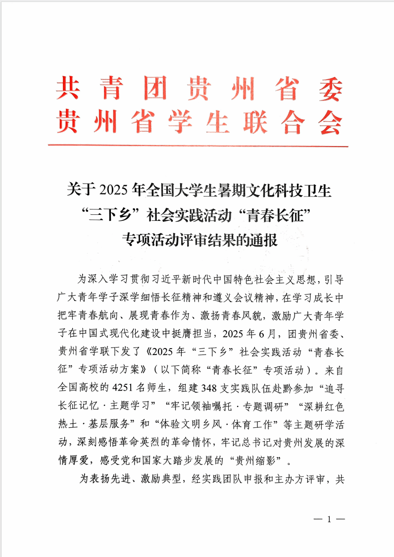 近日,共青团贵州省委公示2025年全国大学生暑期“三下乡”社会实践活动“青春长征”专项活动优秀实践团队表扬名单,beat365“星火”实践队成功入选。