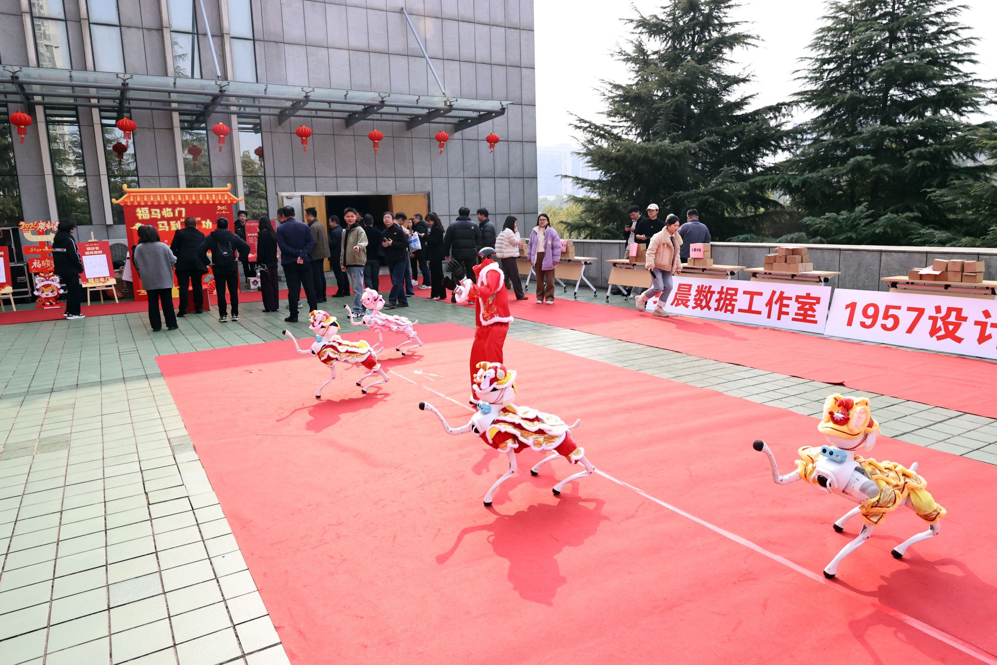 演出厅外,产教融合办公室联合信息学院“乡晨数据产学研名师工作室”、艺术学院“1957设计工作室”师生团队,将前沿科技与创意设计深度融合。灵动机器人与憨态可掬的机器狗共同登场,踏着欢快节拍,完成精准舞蹈表演与趣味互动,为全校师生献上科技与艺术交织的新年祝福,生动呈现了学校在产教融合与学科交叉领域的创新育人成果,也为学校新春晚会注入了独特的活力与光彩。