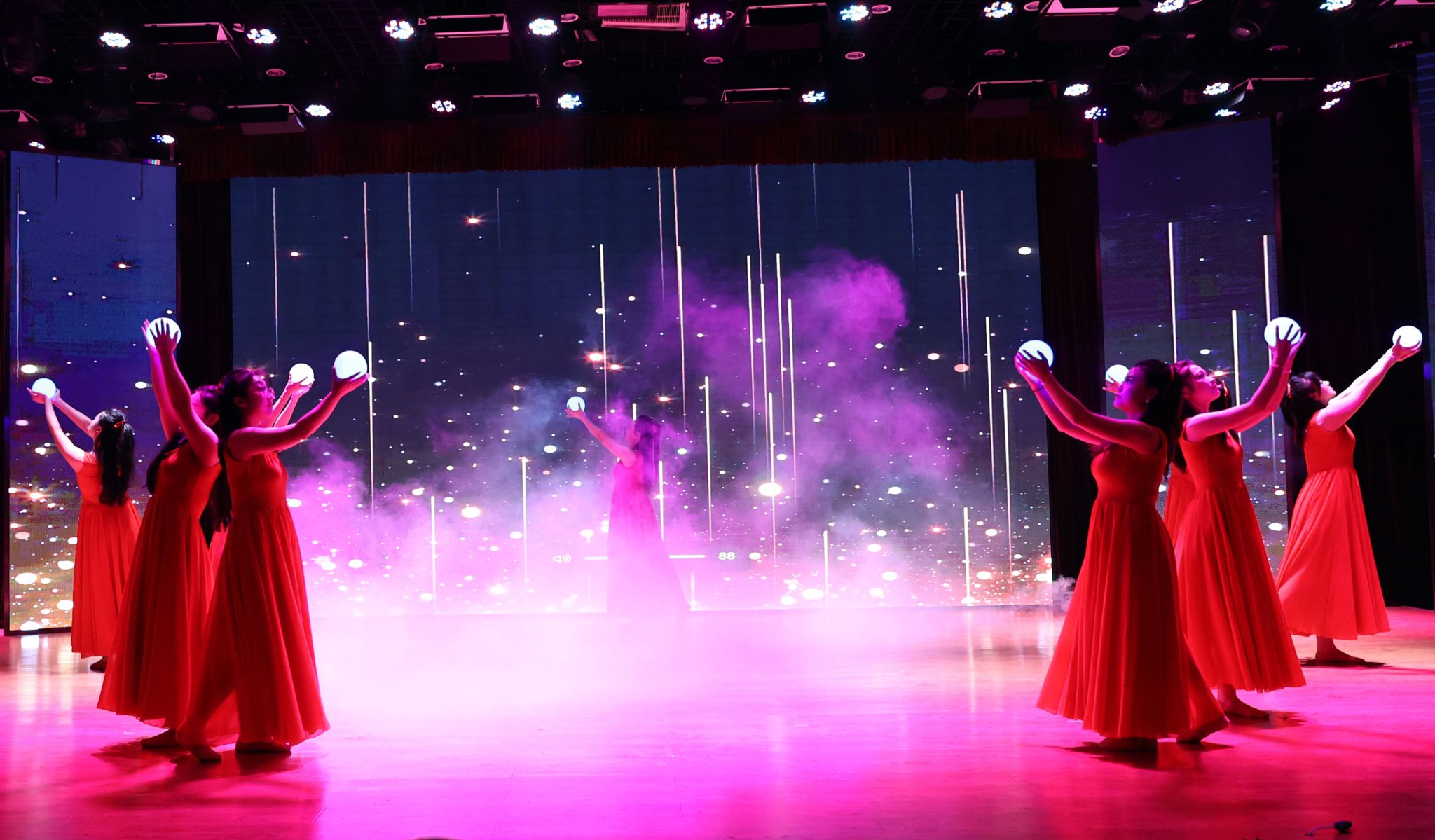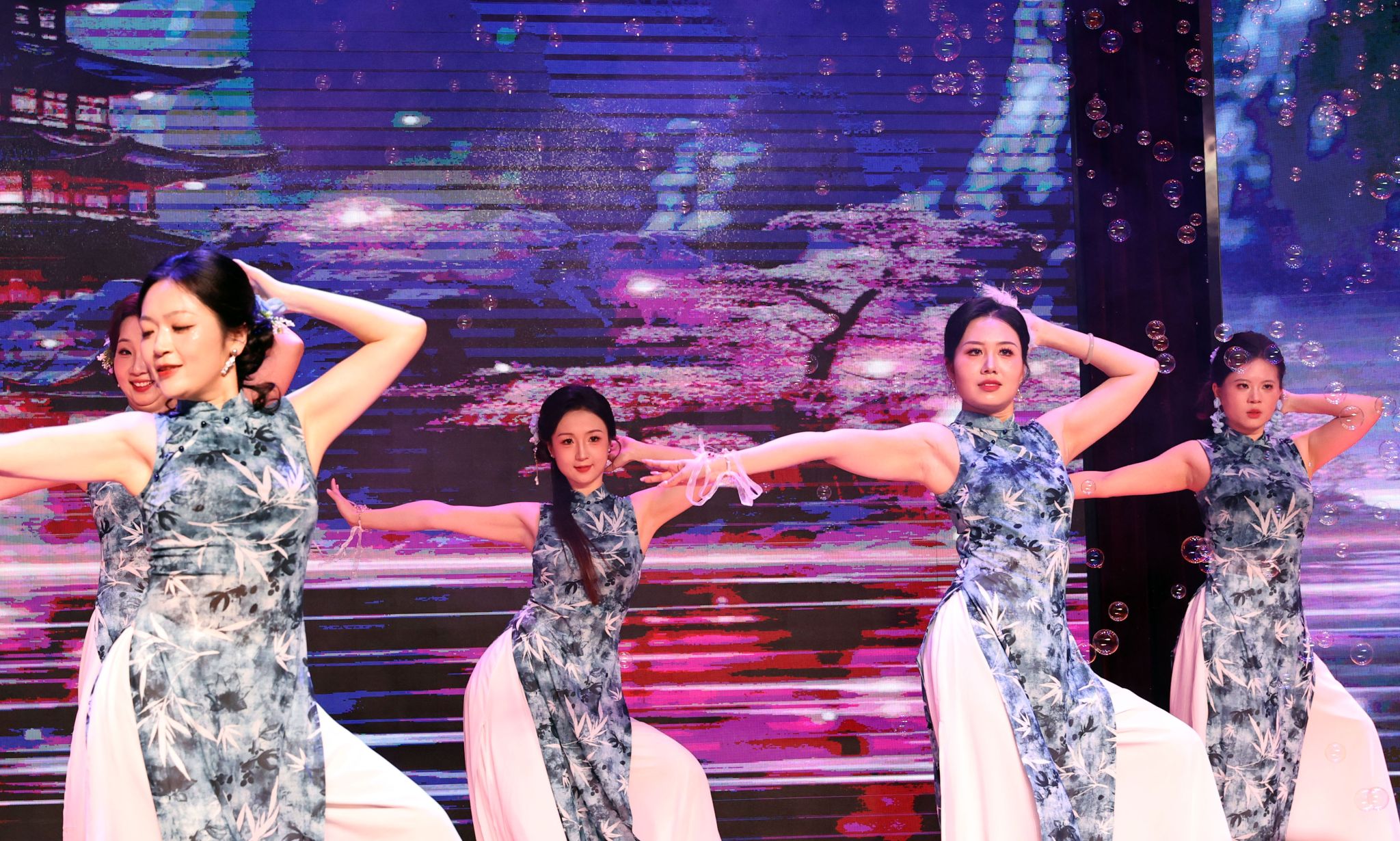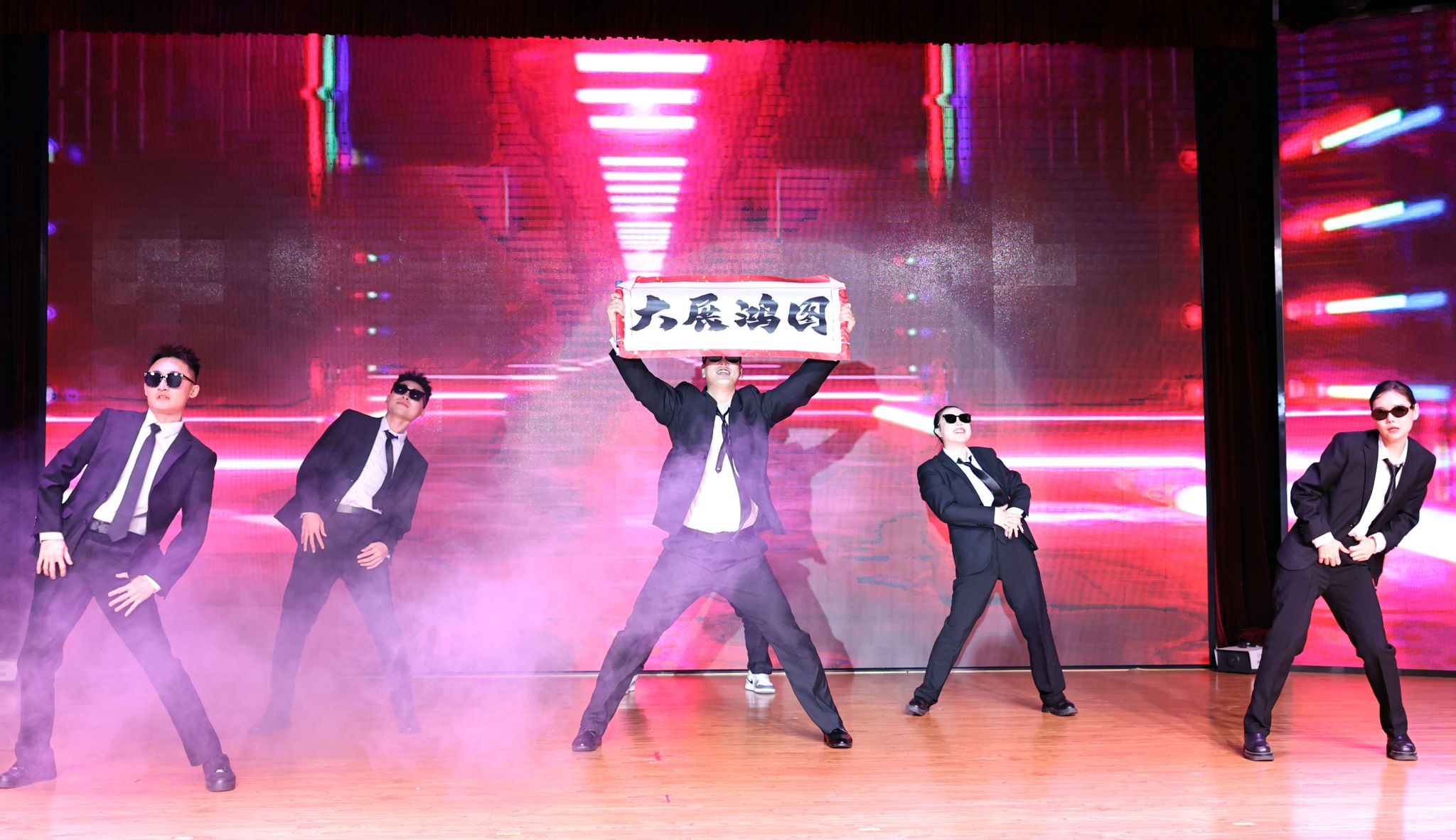 商学院教师带来的舞蹈《清风明月》,一改课堂严肃形象,以柔美古典舞惊艳众人。哑剧《你有我也有》以幽默对比展现“1957号”列车上新老教师的不同工作方式,最终定格于新教师虚心请教的感人画面,生动诠释“传承”的真谛。让人耳目一新的AI对唱节目《新春的画卷》中,艺术学院院长李娇与学院党委副书记张亮以AI形象与真人教师同台,演绎由本院教师作曲填词的原创歌曲,科技与艺术交融令人赞叹。歌舞《月影奇缘》蓝裙翩跹,月灯如梦;体育学院教师带来的《摩登先生》西装劲舞,帅气逼人,引爆全场欢呼。