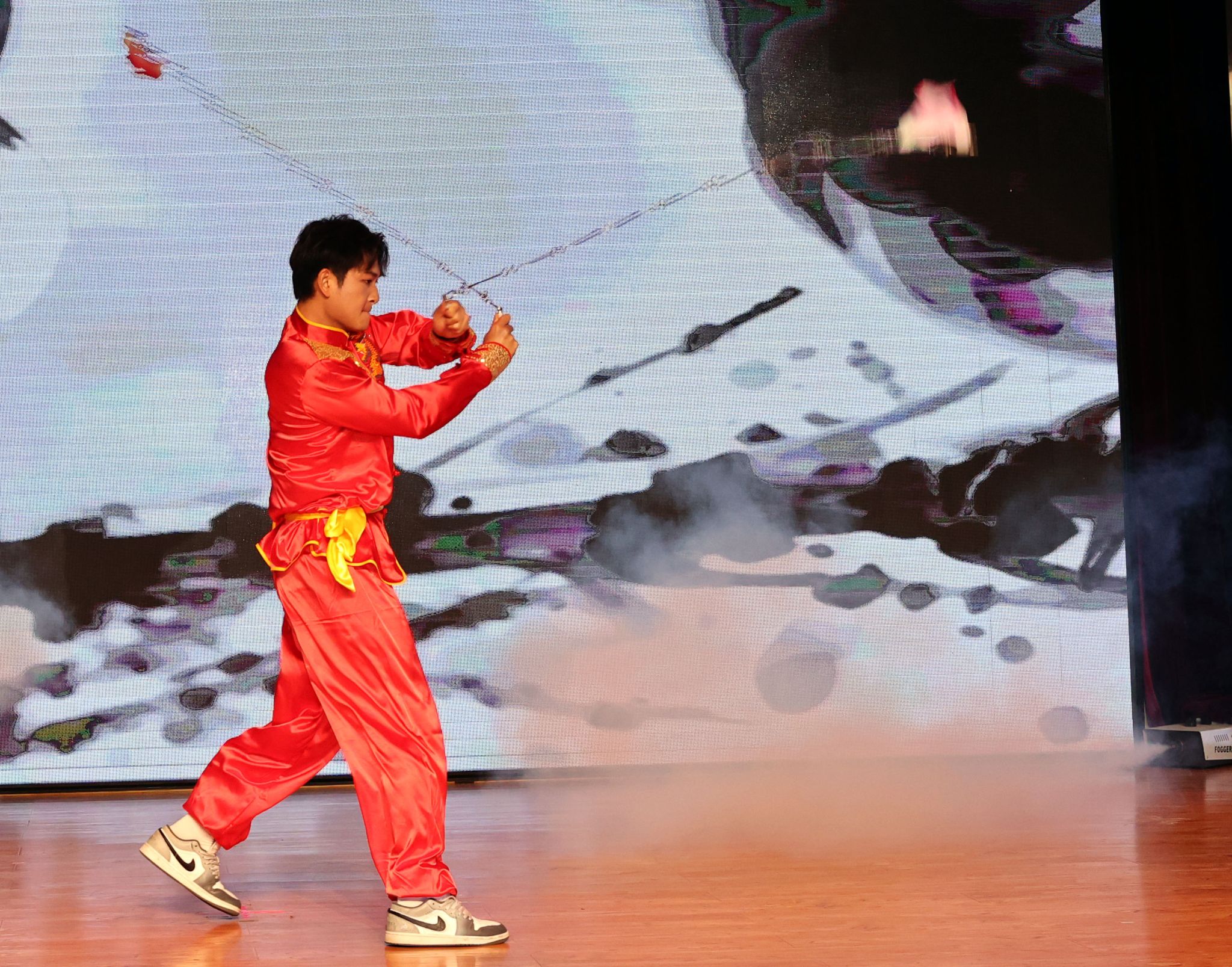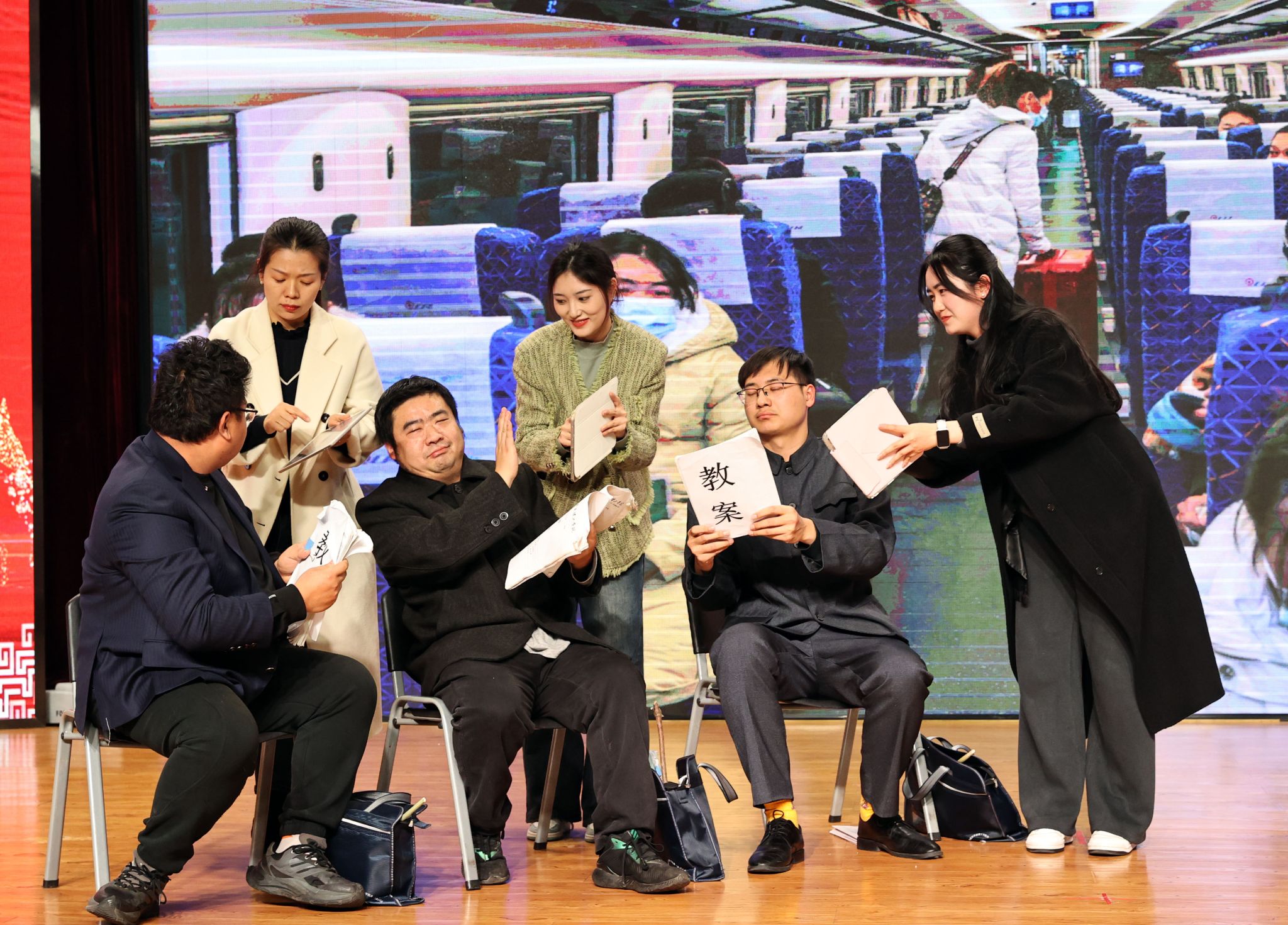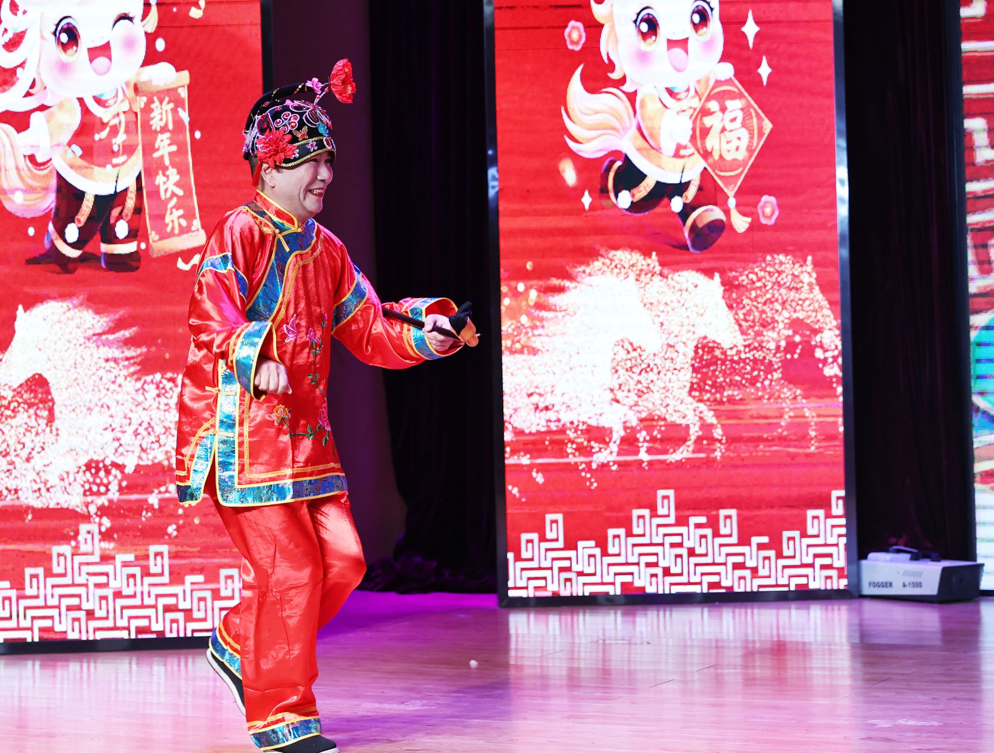 商学院教师带来的舞蹈《清风明月》,一改课堂严肃形象,以柔美古典舞惊艳众人。哑剧《你有我也有》以幽默对比展现“1957号”列车上新老教师的不同工作方式,最终定格于新教师虚心请教的感人画面,生动诠释“传承”的真谛。让人耳目一新的AI对唱节目《新春的画卷》中,艺术学院院长李娇与学院党委副书记张亮以AI形象与真人教师同台,演绎由本院教师作曲填词的原创歌曲,科技与艺术交融令人赞叹。歌舞《月影奇缘》蓝裙翩跹,月灯如梦;体育学院教师带来的《摩登先生》西装劲舞,帅气逼人,引爆全场欢呼。