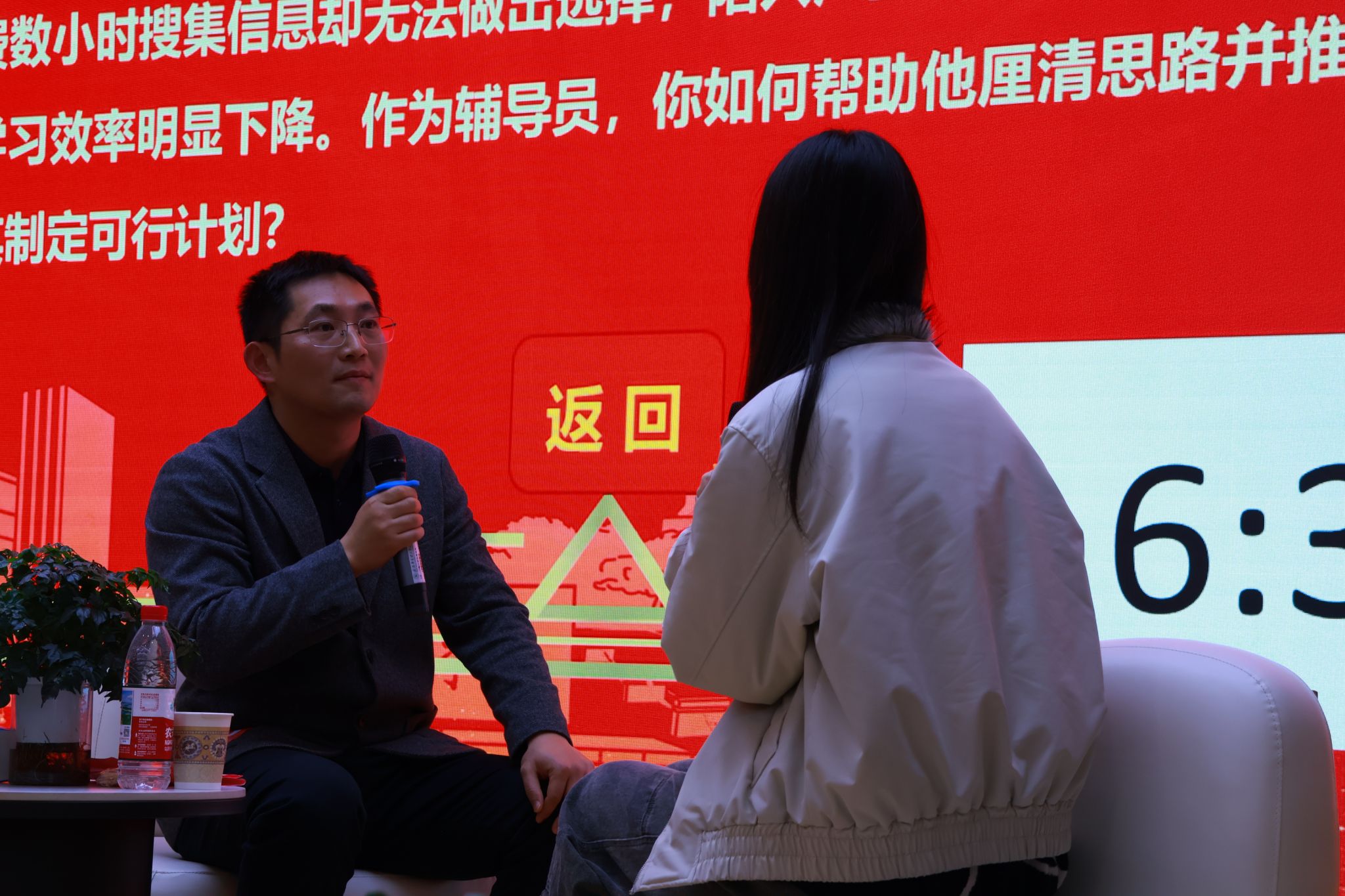 在谈心谈话环节,面对由学生扮演的“迷茫新生”“被骗同学”“考研焦虑学生”等角色,辅导员以倾听化解隔阂,以共情点燃希望,生动诠释“润物无声”的育人艺术。