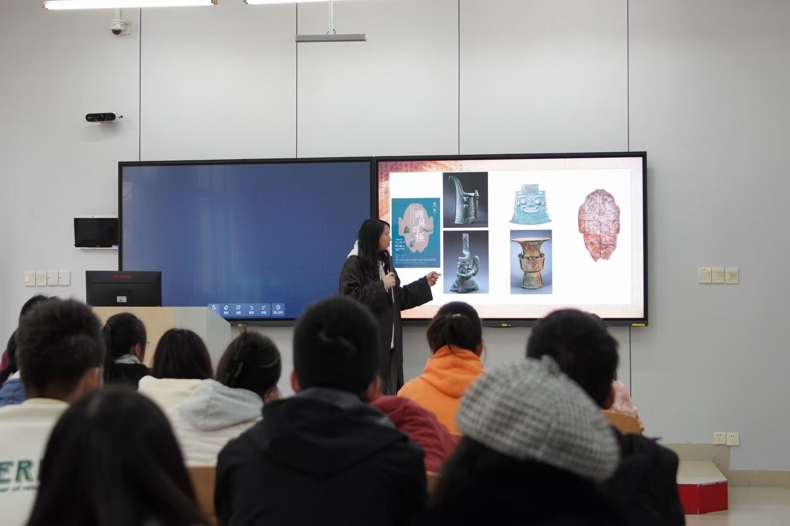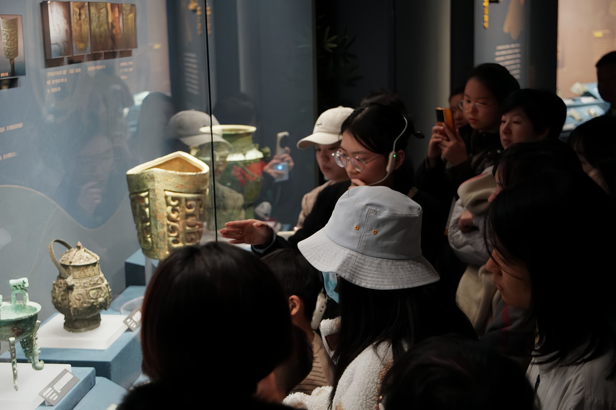 此外,同学们还有幸参观了“商翼四极——商朝地方文明展”,讲解员从“南乡”“北境”“西土”“东方”四个单元,为同学们逐一讲解了大洋洲虎耳扁足鼎、宁乡铜铙、龙形觥、殷墟花园庄东地刻辞卜甲、长发青铜跪坐人像及亚醜钺等来自10余个省市及地区的上百件商代代表性文物。展厅内一件件珍贵的展品,不仅展示了商朝时期各地的特色文化,也反映了当时社会的繁荣和文明的发展。
