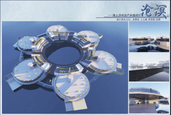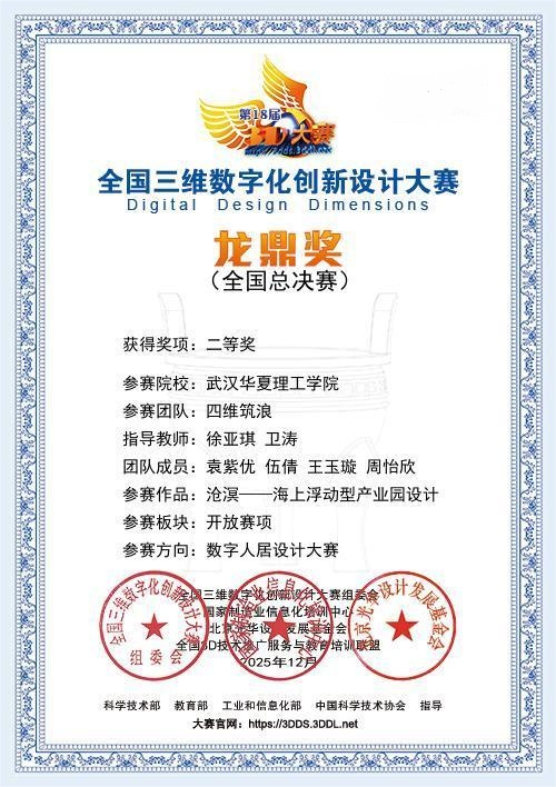 土木建筑工程学院参赛团队以作品“沧溟——海上浮动型产业园”荣获国赛二等奖。该项目围绕海洋空间综合利用与可持续发展,融合绿色建筑、智能规划与数字化仿真技术,体现了土木工程学科在面向国家海洋战略与产业升级需求中的创新应用能力,展示了学院在复合型人才培养方面的成效。