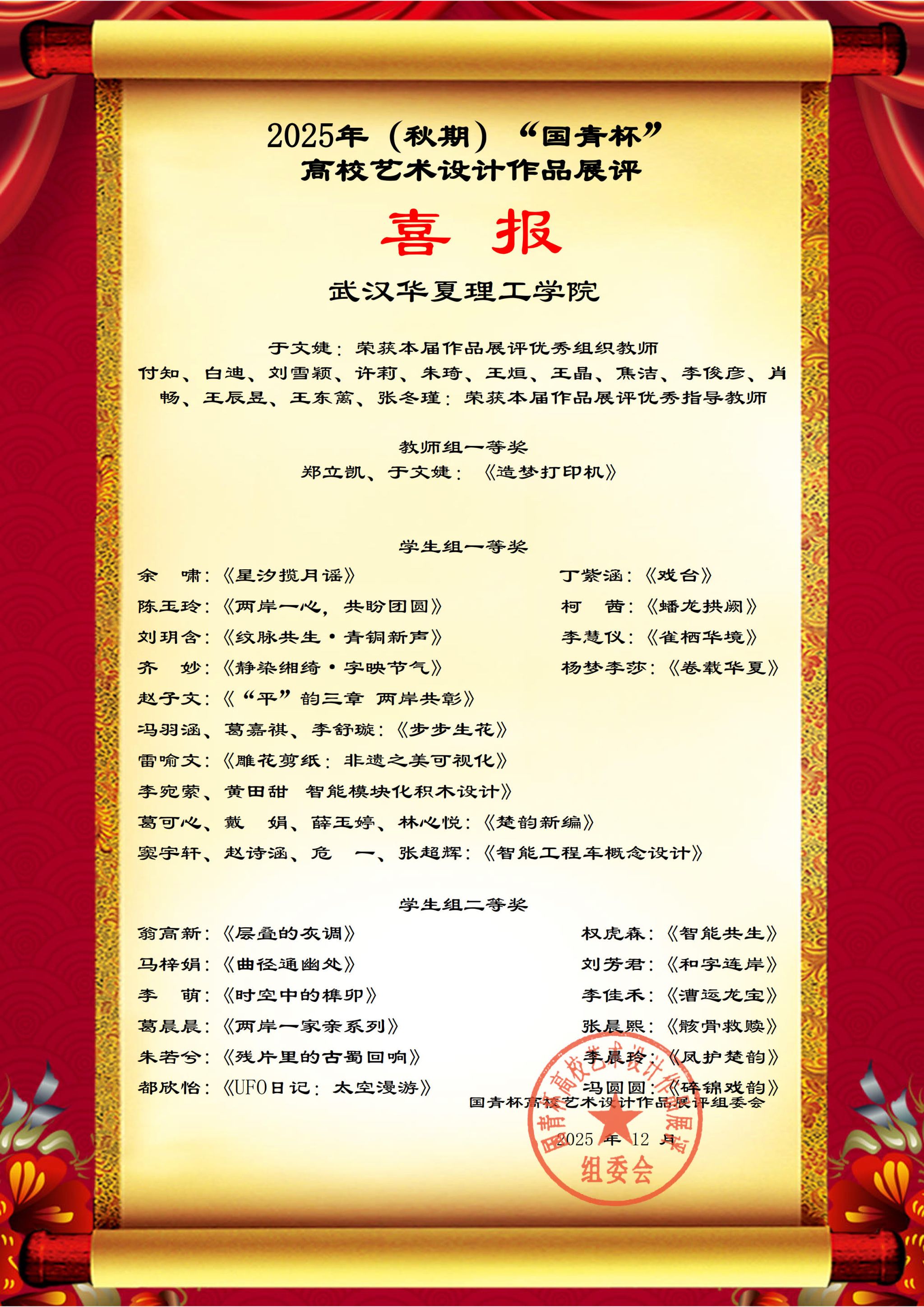 艺术设计与传媒学院院长李娇表示,学院将继续以学科竞赛为重要抓手,持续深化教学改革,强化实践教学环节,积极营造浓厚的创新创作氛围,致力于培养更多基础实、素质高、能力强,兼具艺术创造力与社会责任感的高水平应用型设计人才,为服务地方文化创意产业发展贡献更大力量。