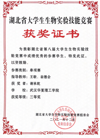 湖北省第八届大学生生物实验技能竞赛单项赛三等奖