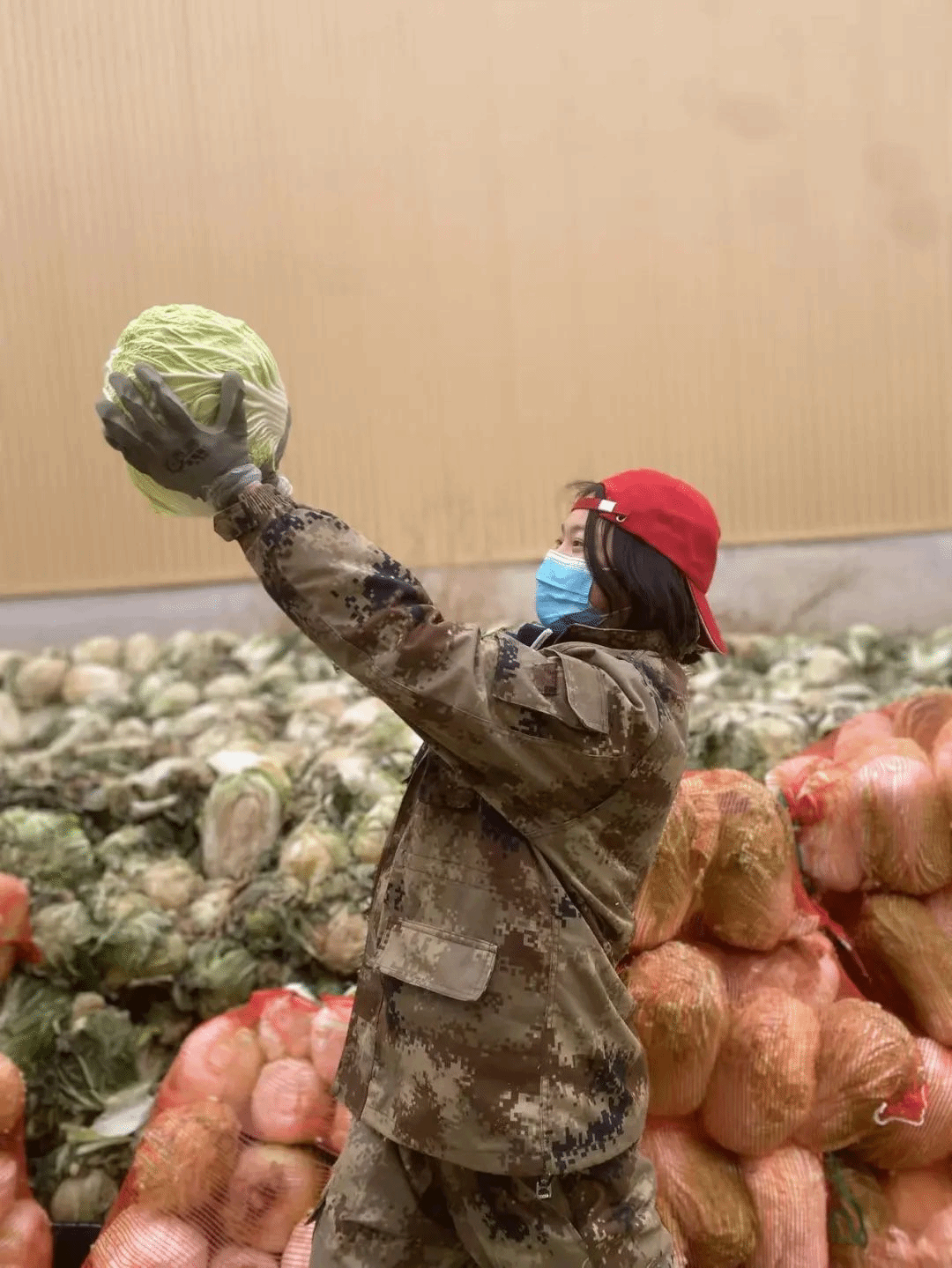 一个小马扎,一把菜刀,零下10几度,在白菜山上坐了3天,冷冻的大白菜不好削,只能用手把坏叶子扒掉,刀豁了口,手套、鞋袜也被白菜发酵的汁水浸湿了。削菜,扎捆,搬运,就这样她和其他组员们一起完成了1000余袋的量。看着一颗颗白菜被源源不断地送上了货车,雷馨心里成就感满满。但更让她内心感受到触动的,是她重新回归小区的协助核酸岗位时,一位受助者的反应。