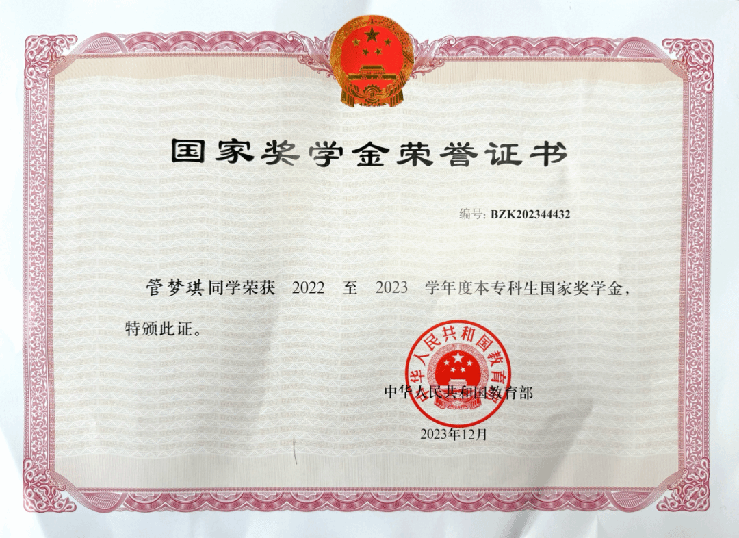 “学习的目的不为获奖,仅仅只是希望通过自身的勤勉学到更多的知识。”虽然只是轻飘飘的一句话,她却真正做到了连续三年专业成绩第一,揽获校级“三好学生标兵”“一等奖学金”“优秀三好学生”“优秀共青团员”等多项荣誉,并顺利拿到2023年度国家奖学金。