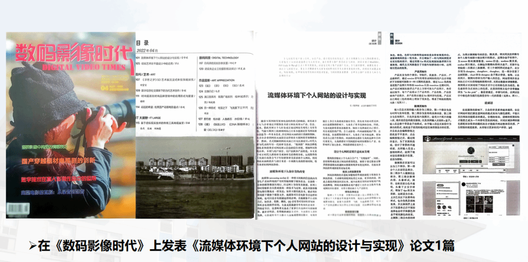 努力学习潜移默化带给她的远远不止以上这些。大一时候的她,很喜欢《网页设计》这门课程,连老师没有采用的教材版本她都会认真看好几遍。在她眼里,写代码不仅不枯燥,相反非常有成就感,尤其是设计比较漂亮的一些网页。设计网页的时候,她的主题经常会围绕她最喜欢的歌手展开,所以每次上课她都很快乐。2022年12月,她将网页设计相关的心得体会和研究成果汇总成论文《流媒体环境下个人网站的设计与实现》并顺利在《数码影像时代》上发表。
