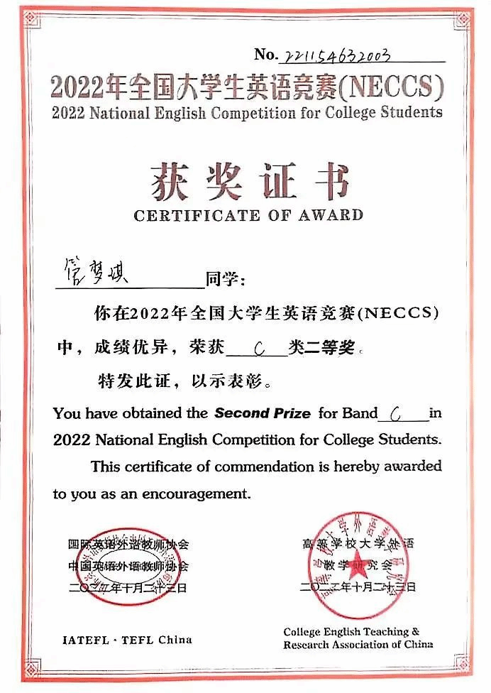 四季交替,阴明圆缺,冷暖变化,她一以贯之地坚持着。也正是这份信念,点亮了第一次英语考试成绩遗留的黯淡。截至目前,她在英语竞赛领域已经获得了“全国大学生英语竞赛二等奖”“第八届全国中西部外语翻译大赛二等奖”“湖北省翻译大赛省级一等奖”等多个奖项。英语不仅成为了她的热爱,更成为了她的骄傲。