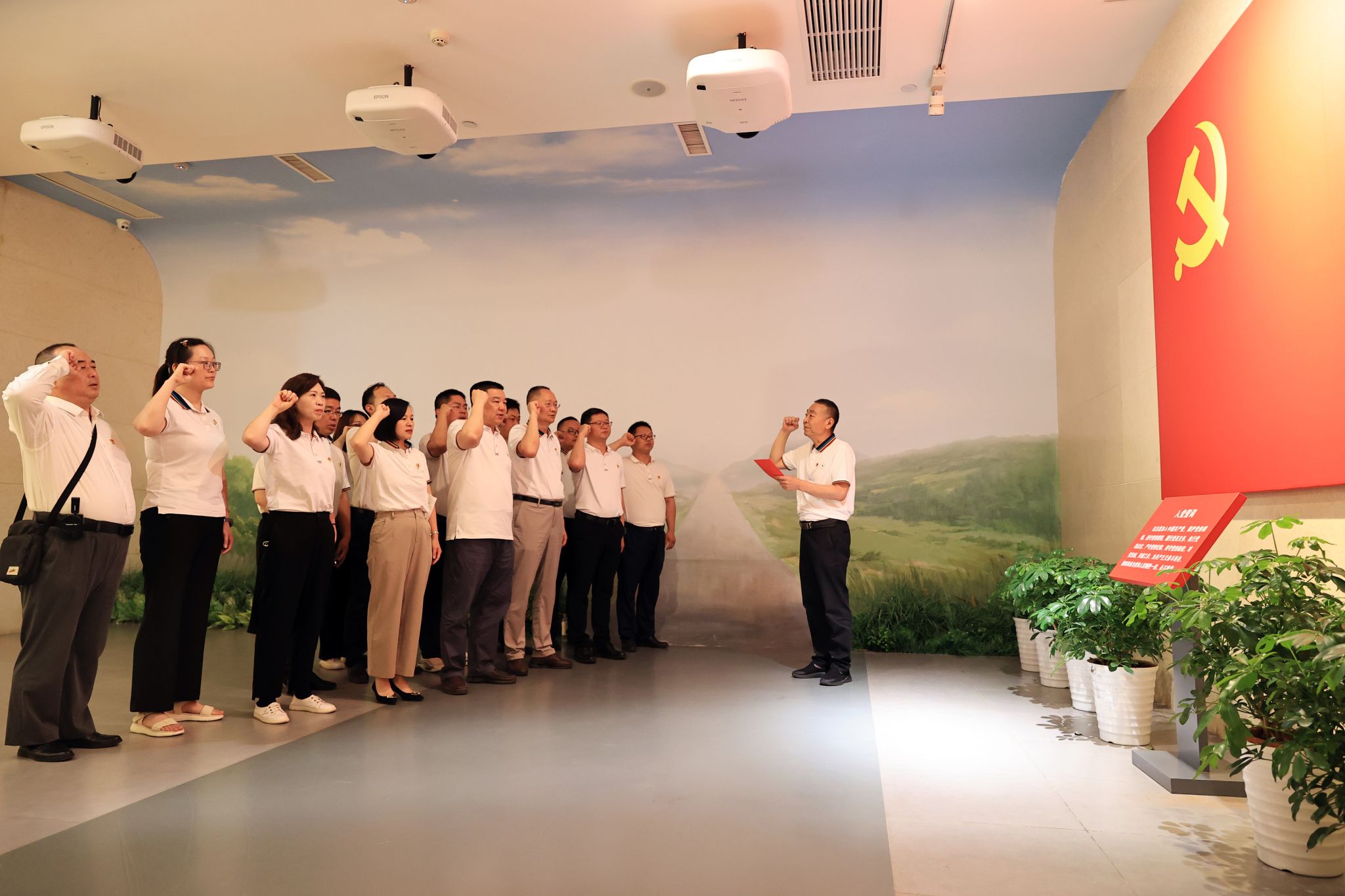 在陈列馆一楼鲜艳的党旗前,全体党员干部庄严地重温了入党誓词,以铿锵有力的宣誓声,厚植共产党人的爱党情怀,坚定共产党人的崇高追求和使命担当,永葆对党绝对忠诚的政治本色,表达了不忘初心、牢记使命、奋发有为的信念和决心。