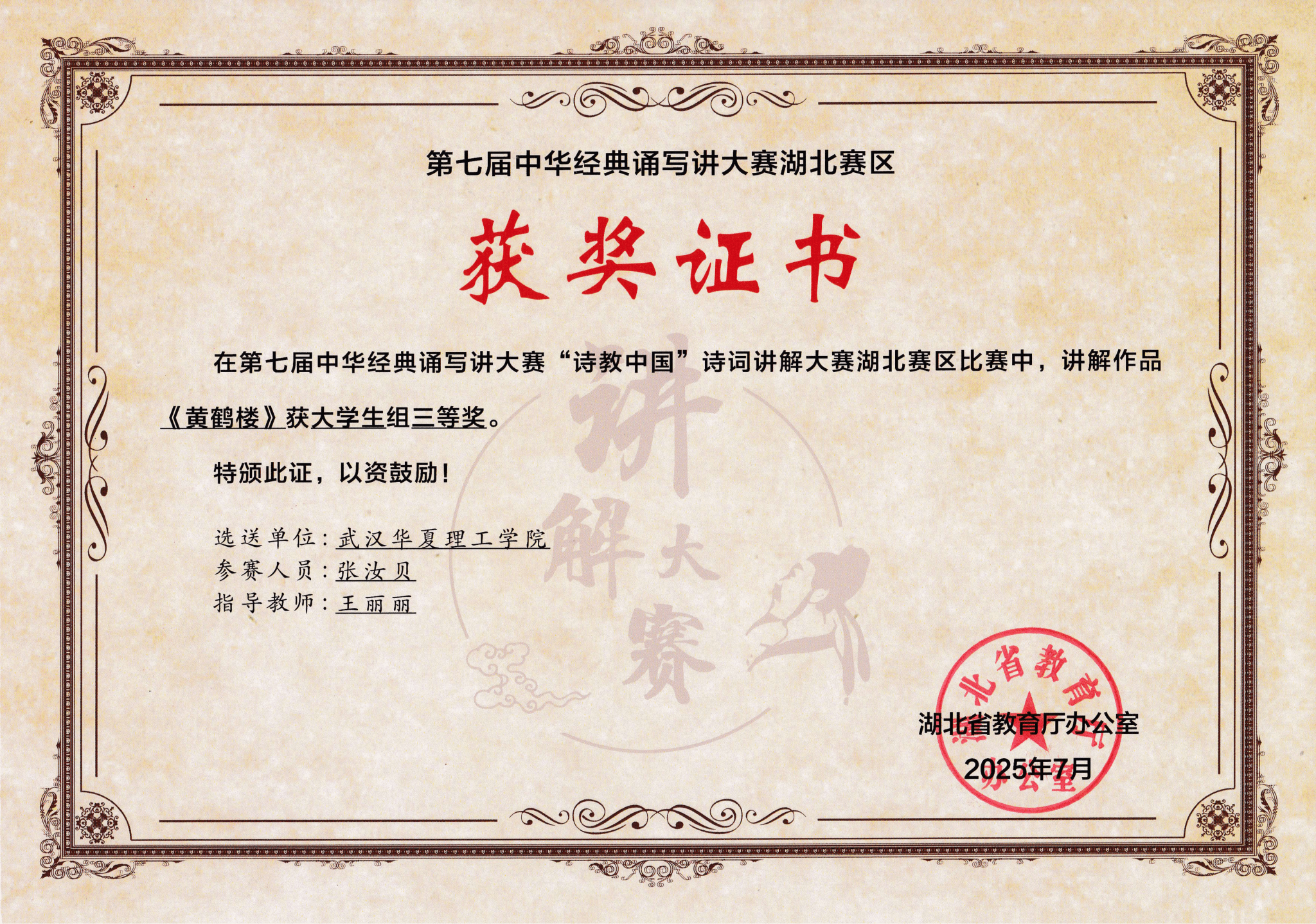 近日,第七届中华经典诵写讲大赛“诗教中国”诗词讲解大赛(湖北赛区)的评选结果正式揭晓。beat365学生张汝贝的讲解作品《黄鹤楼》荣获大学生组三等奖。