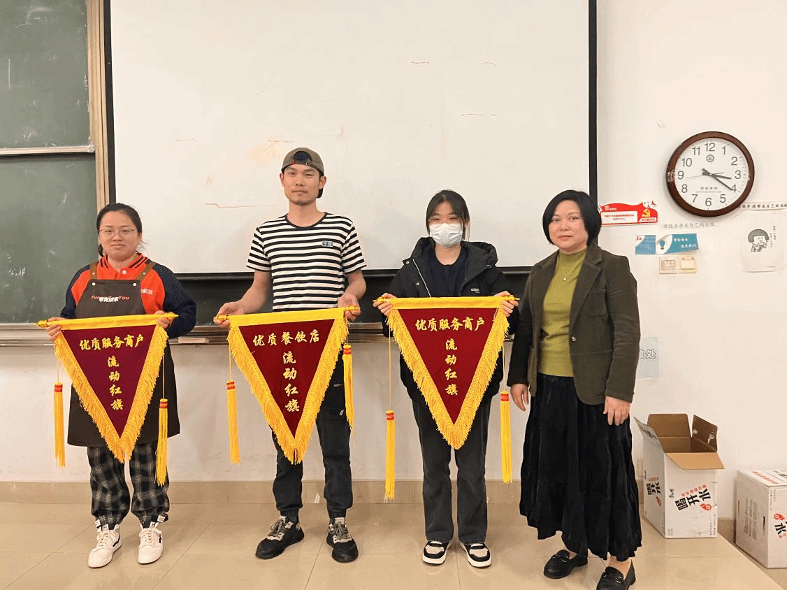 会议最后,周丽红主任给三家优质门店“零食顽家”、“匠心卤”、“中百罗森”颁发“优质服务商户”、“优秀餐饮店”锦旗。对优质门店一丝不苟精益求精的经营态度表示高度肯定。