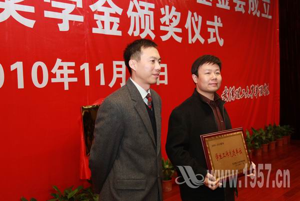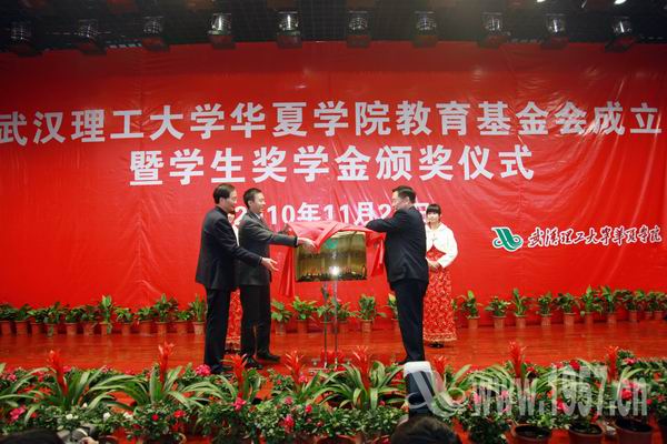 湖北省民政厅文增显副厅长、武汉理工大学华夏学院董事长张晓东、武汉理工大学华夏学院教育基金会理事长吴永桥共同为基金会揭牌。