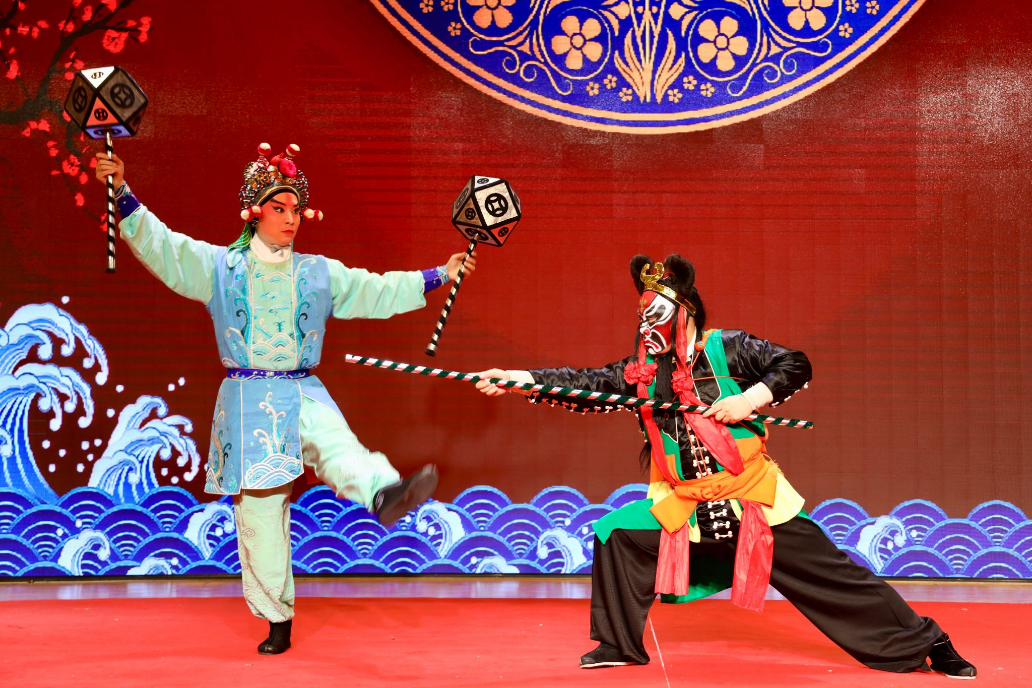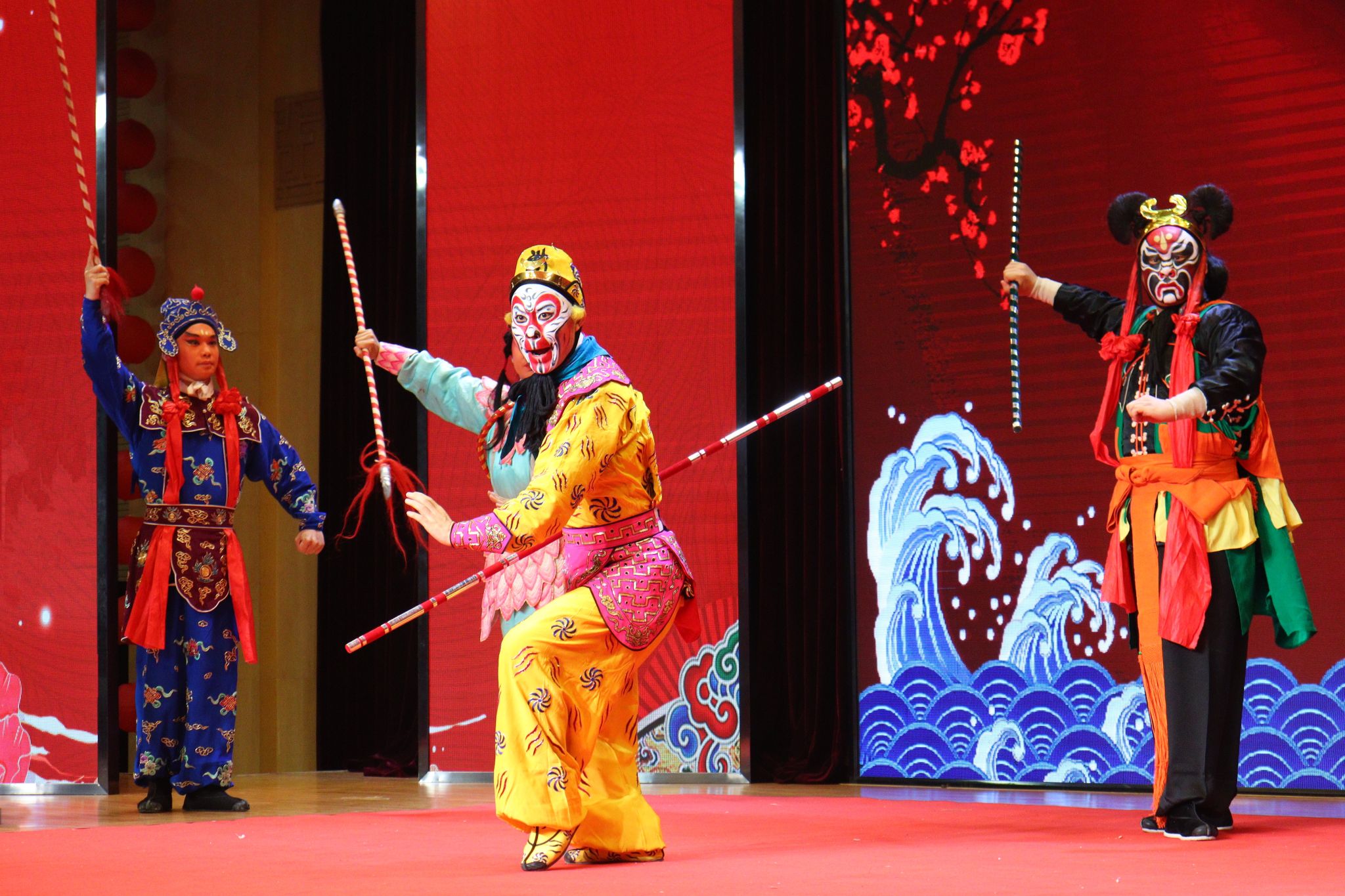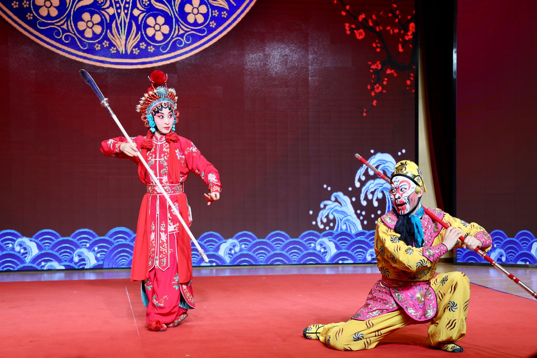 “愿得一心人,白首不相离。”一首浪漫的爱情戏曲《拾玉镯》拉开了本次活动的帷幕。舞台上,演员们通过精湛的唱功、丰富的情感表达、形神兼备的演绎,将男女主复杂的内心世界和跌宕起伏的故事情节生动形象地呈现给了观众。“三十功名尘与土,八千里路云和月。”高亢激昂的《岳母刺字》曲调痛楚,声音慢慢,直入人心。《泗州城》则尽显武旦角色的功底。一系列高难度的打斗场面和舞蹈动作,如拍枪、挑枪、踢枪等,给观众带来了极佳的视觉享受。