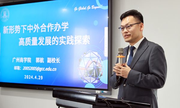 会上,郭航教授详细解读了中外合作办学在新形势下的政策支持和发展现状,深入剖析了中外合作办学在提升学校教育教学质量、拓宽师生国际视野等方面的重要作用,并分享了广州商学院在国际教育方面的宝贵经验。他提到,经过二十多年的发展,广州商学院已与美、英、澳、加、德、日、新等21个国家和地区的113所知名高校签署合作协议,联合开展“中外合作办学双学位项目”“国际联合培养双学位项目”“中英双语创新班项目”“产教融合国际班”“中外专本连读国际班项目”等5个形式的国际化办学项目,已形成“专、本、硕”一体化的国际教育格局,是广东省国际化办学层次最多的本科高校之一。目前,该校国际学院有11个本科专业和7个专科专业,在校学生3300余人。