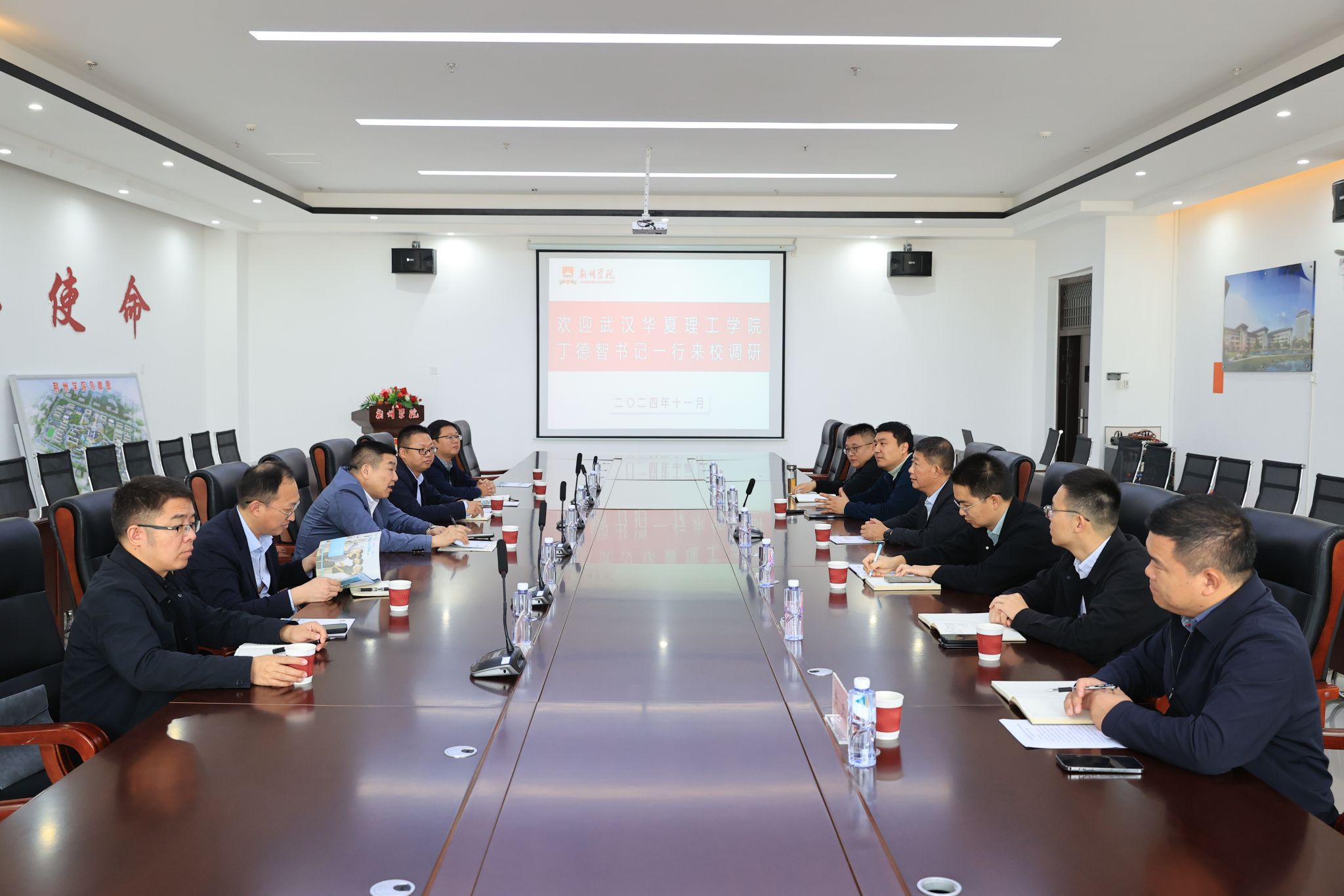 11月12日,党委书记丁德智、党政办公室主任李凯、党委组织部部长淡玉堂、党委宣传部部长龚先军、党政办公室副主任徐双立、党委宣传部校园文化建设与文明创建工作办公室主任张培杰一行六人前往荆州学院新校区,就该校校园建设、二级学院建设进行了走访调研,春来教育集团董事、荆州学院副董事长丁锋,学校党委书记张晓彬、校长戴国强及相关职能部门负责人陪同调研。