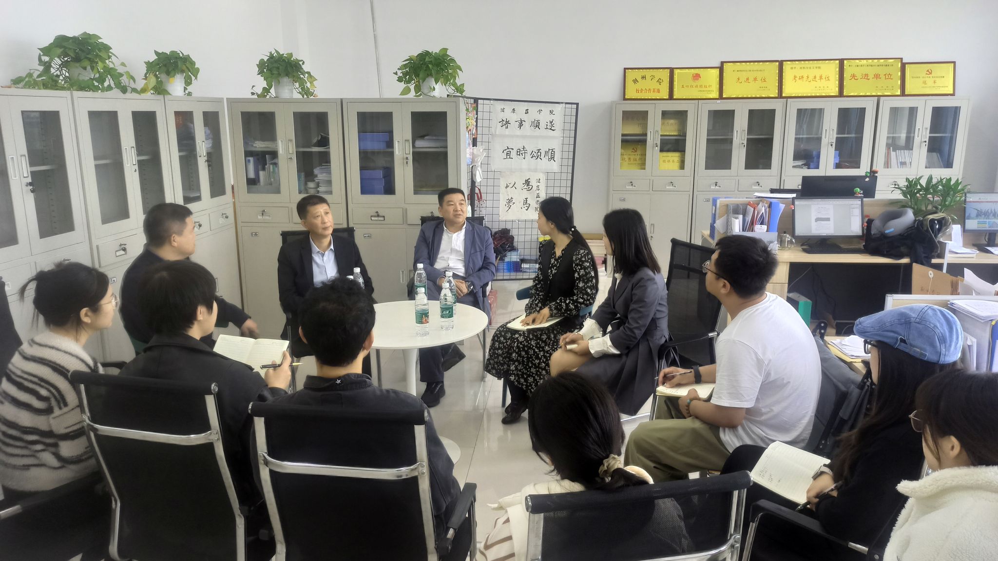 座谈会后,调研组分成两组进行实地走访。丁德智在张晓彬陪同下深入二级学院调研,重点调研了健康医学院、城市建设学院,他与师生党员就党支部“一融双高”建设、支部专题活动开展、支部特色党建工作等进行了座谈交流,并与二级学院负责人就学科建设、专业建设、人才培养、科研工作、产教融合等方面进行了深度访谈。在该校党宣、学工、后勤等负责人陪同下,调研组参观了校园人文景观、植物绿化及生态景观,并实地考察了学生教学楼、公寓楼、大学生活动中心、食堂、图书馆等办学设施。
